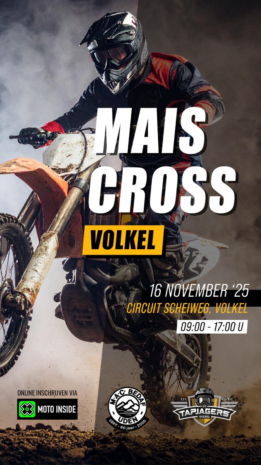 Op zondag 16 november organiseert MAC Bedaf in samenwerking met de tapjagers weer haar jaarlijkse Maisplakcross op haar circuit aan de Scheiweg in Volkel.