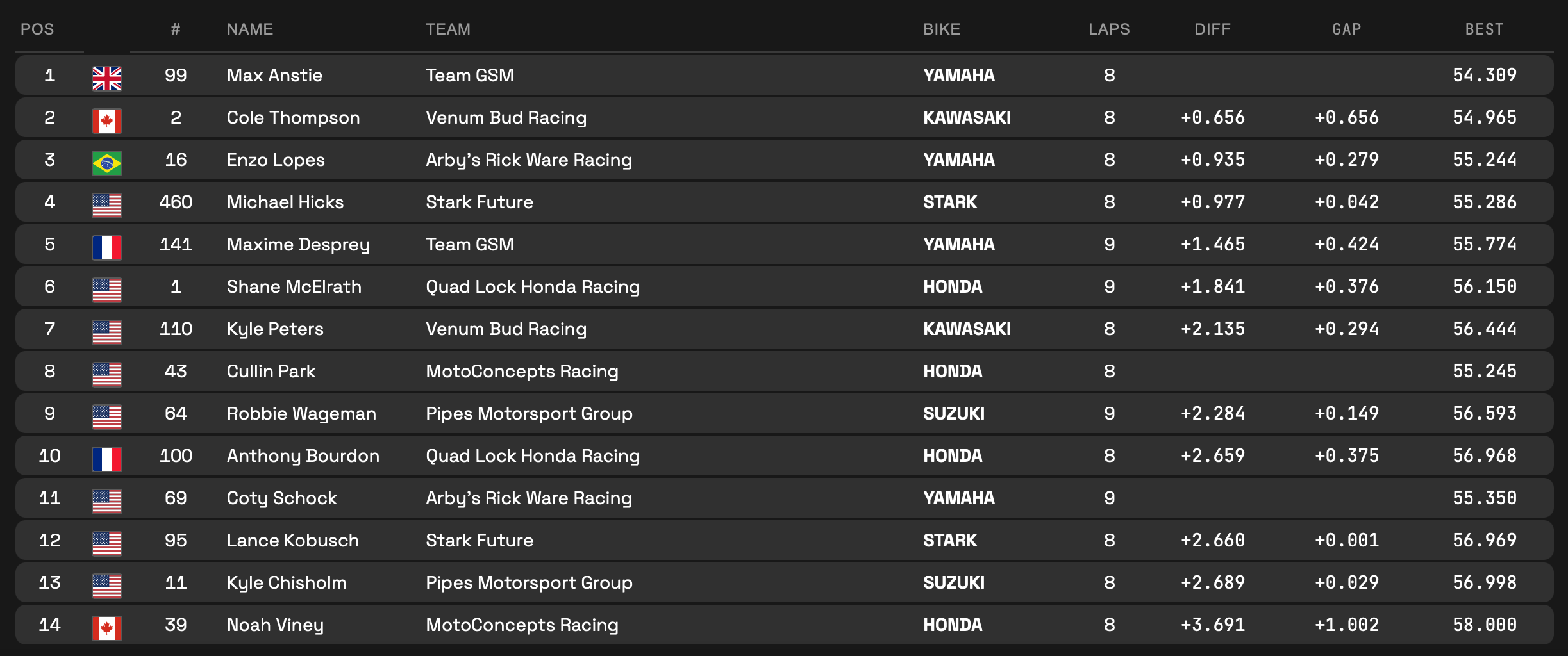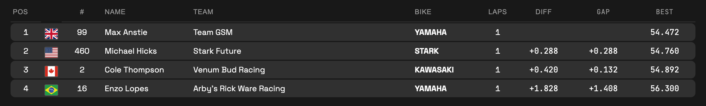 In de tijdtraining van de SX2 klasse was Max Anstie het snelste voor Cole Thompson en Enzo Lopes. Michael Hicks klokte op de Stark de vierde tijd voor Maxime Desprey.