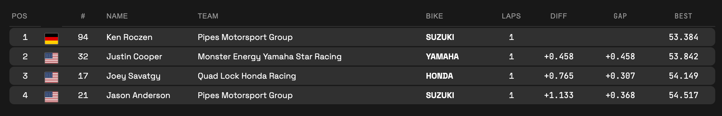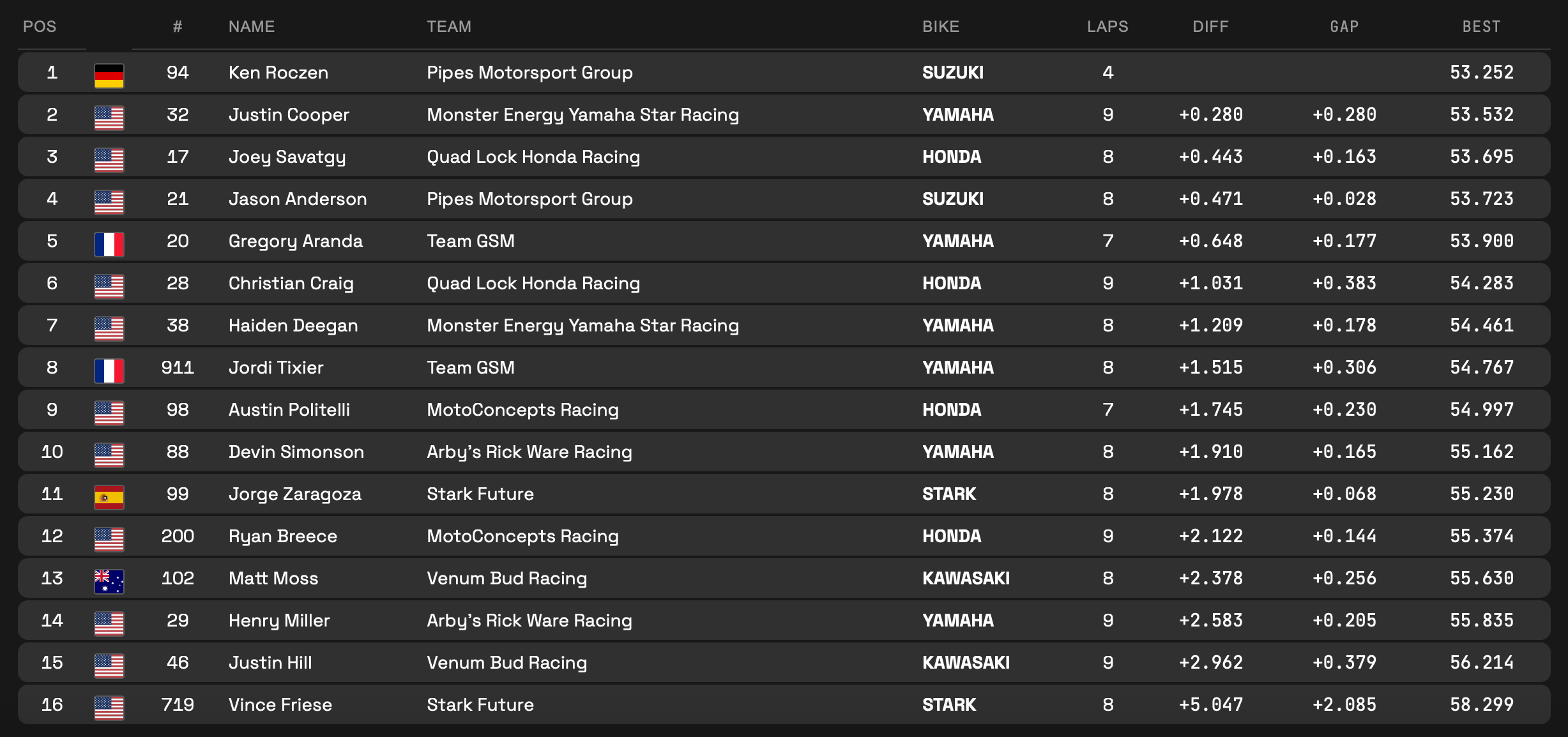 Roczen wist in de tijdtraining van de SX1 klasse de snelste tijd neer te zetten voor Justin Cooper en Joey Savatgy. Jason Anderson en Greg Aranda maakten de top vijf compleet terwijl Haiden Deegan na verschillende snelle ronden genoegen moest nemen met een zevende tijd.