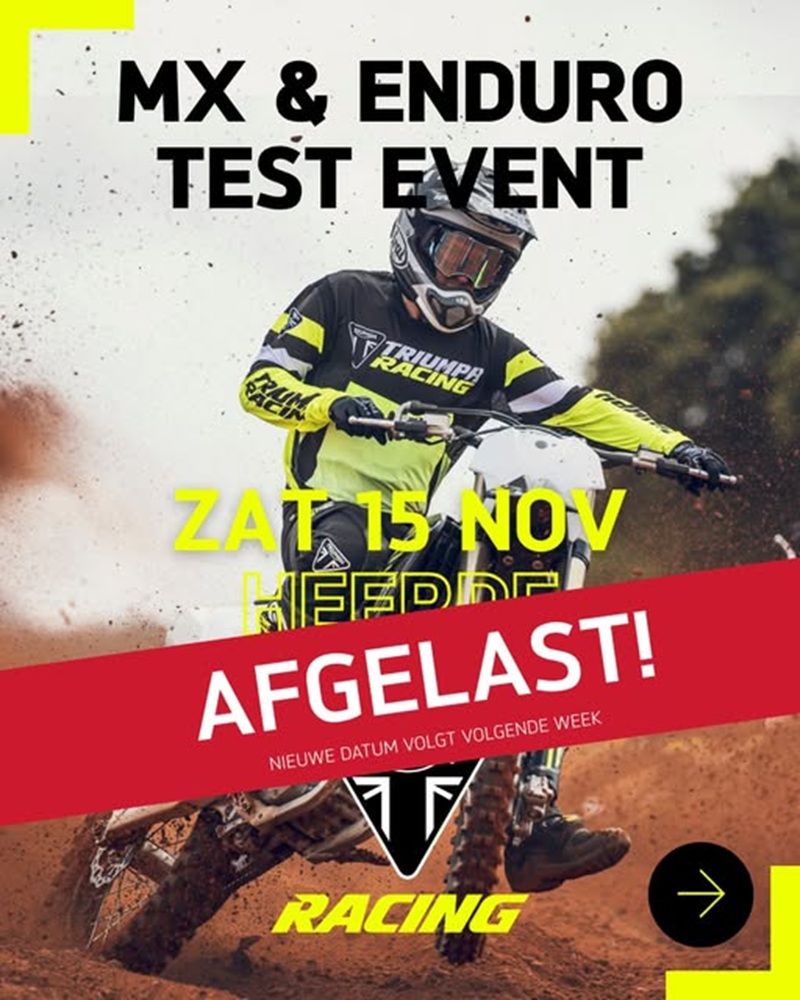 Triumph MX & Enduro Test Event is helaas afgelast! by motocrossplanet14 november 2025 Helaas is het Triumph MX & Enduro Test Event in Heerde, dat morgen gepland stond, door de zware regenval afgelast. Een nieuwe datum volgt volgende week.