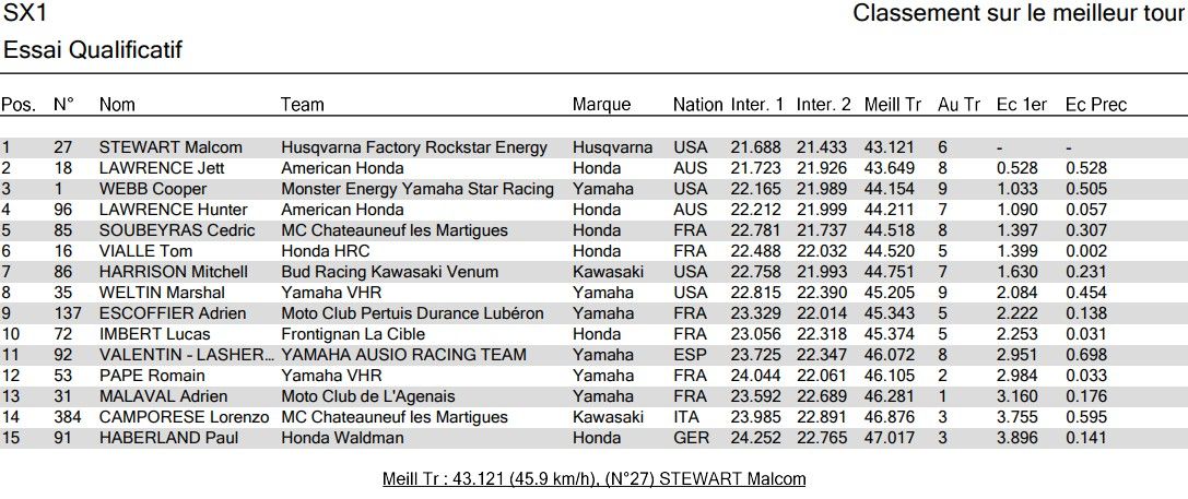 Stewart was in de SX1 klasse het snelste voor Jett Lawrence, Cooper Webb en Hunter Lawrence. De Fransen Cedric Soubeyras en Tom Vialle trainden als vijfde en zesde.