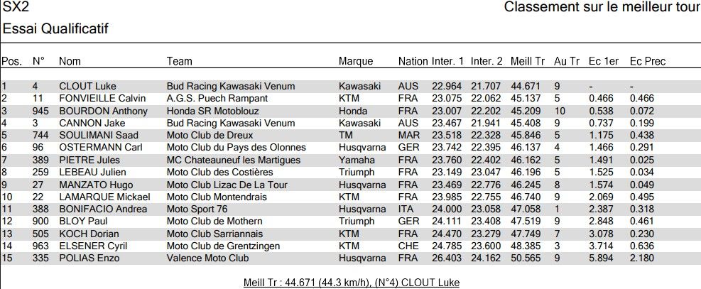 In de SX2 klasse was Luke Clout het snelste voor Calvin Fonvieille en Anthony Bourdon. Jake Cannon en Saad Soulimani maakten de top 5 compleet.