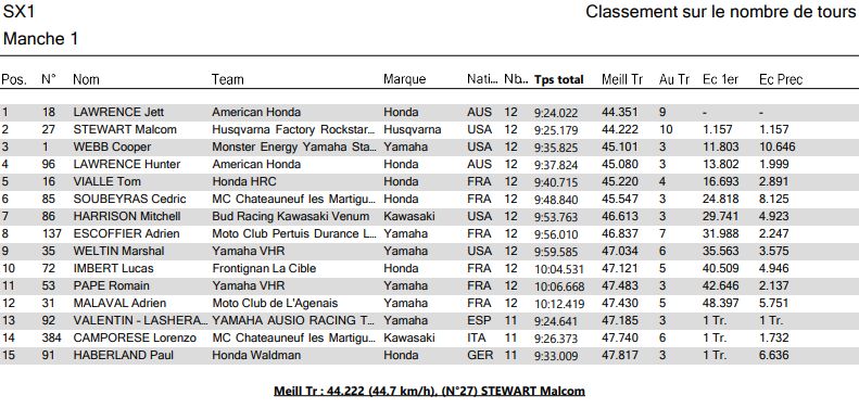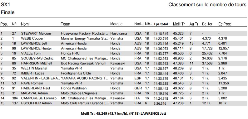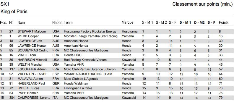 Malcolm Stewart heeft de titel King of Parijs weten te veroveren. Na zijn zege op zaterdag wist hij met tweemaal een tweede plaats achter Jett Lawrence in de sprintraces en een overwinning in de finale de eindzege te pakken. In de finale werd Cooper Webb tweede voor Jett Lawrence.