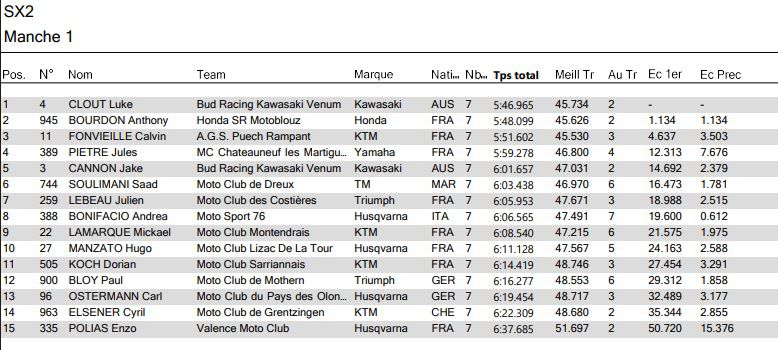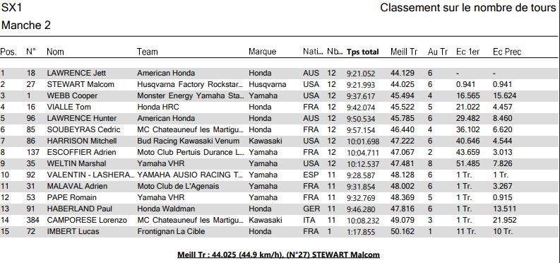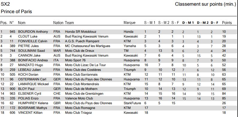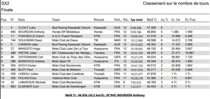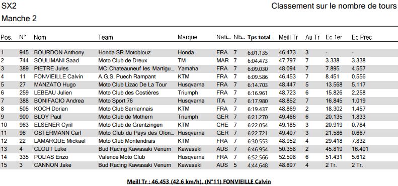 In de SX2 klasse ging de eindzege naar Anthony Bourdon. Hij won de eerste sprintrace en werd in de andere tweede. Ook in de finale werd hij tweede en dit was voldoende voor de eindzege.