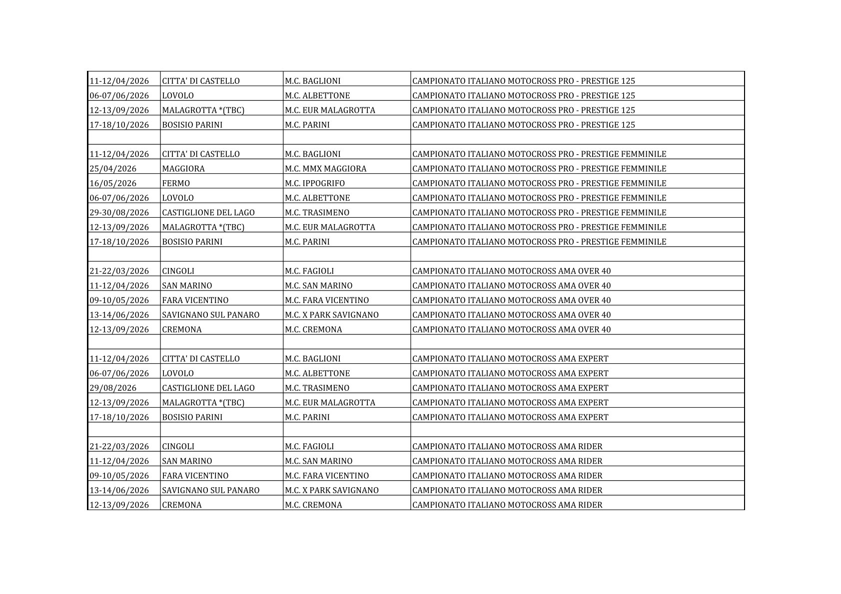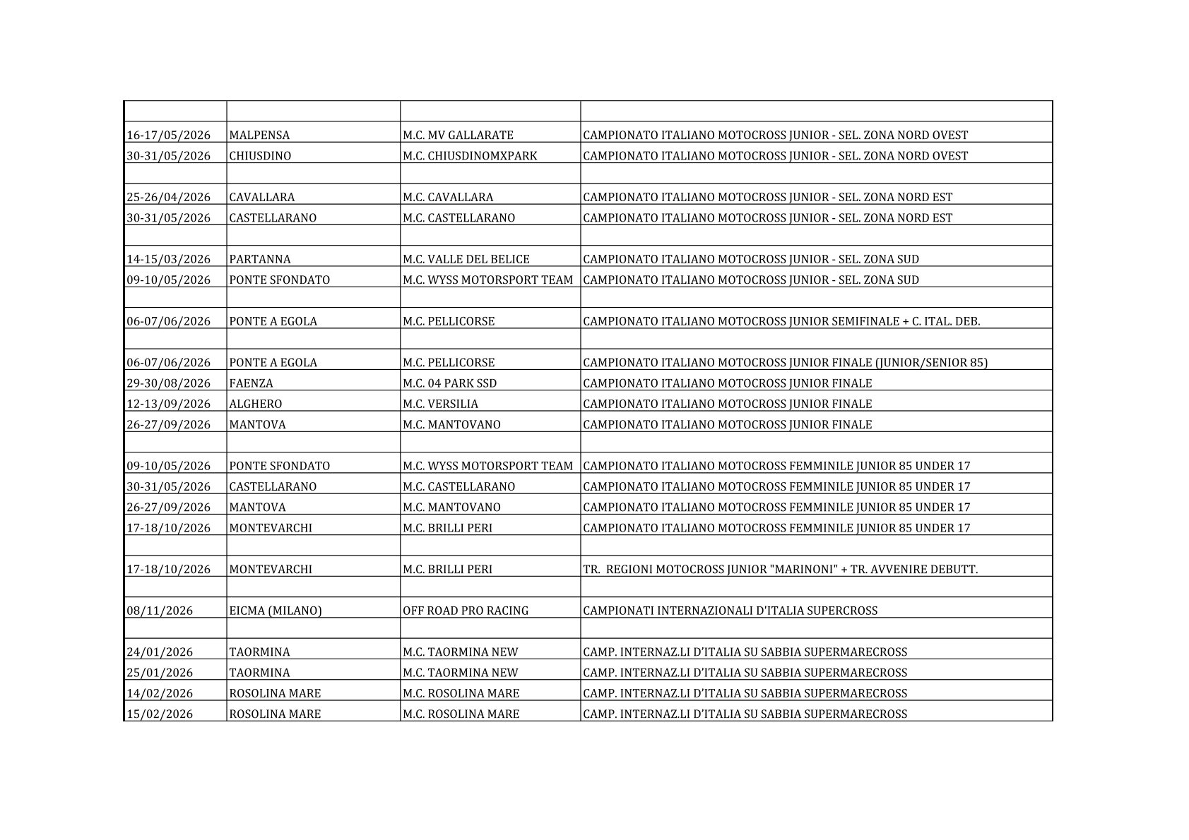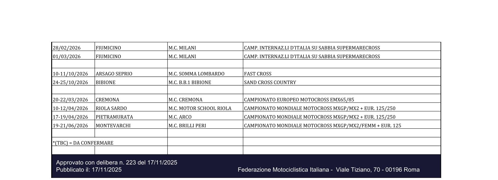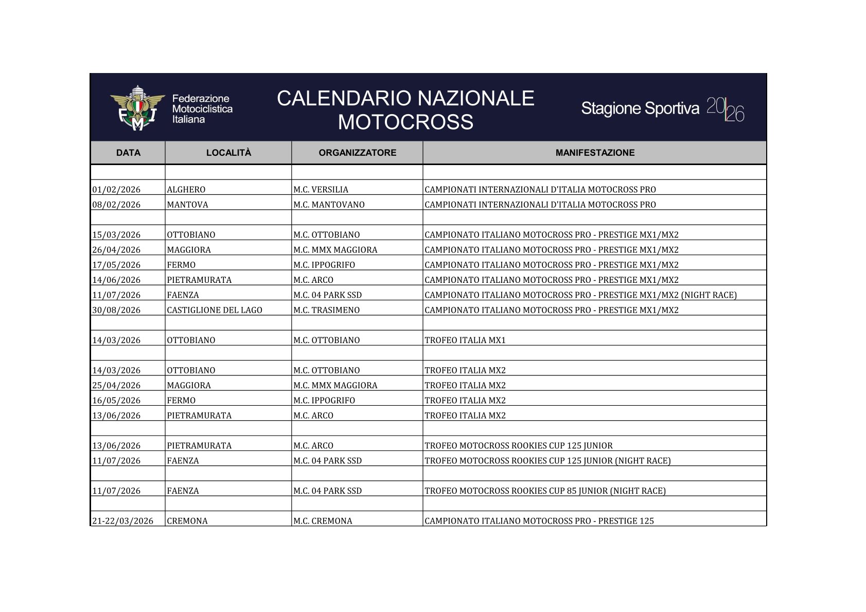 De kalender van het Italiaans Kampioenschap 2026 is bekend. Het Italiaanse cross seizoen begint opnieuw vroeg want het internationale kampioenschap start al op 1 februari in Alghero, gevolgd door de tweede wedstrijd op 8 februari in Mantova.