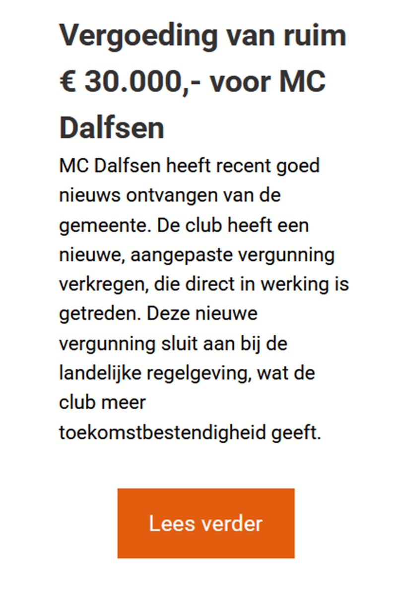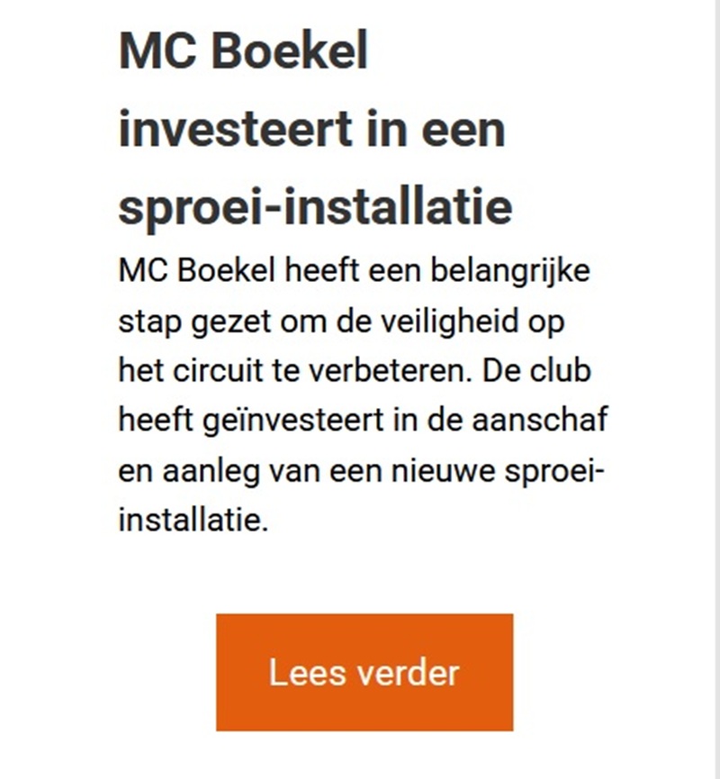 We zijn verheugd je te kunnen melden dat het MX-Masterplan druk bezig is met praktijktesten van veiligheidssystemen, MC Dalfsen een vergoeding heeft ontvangen en dat MC Boekel geïnvesteerd heeft in een sproei-installatie.