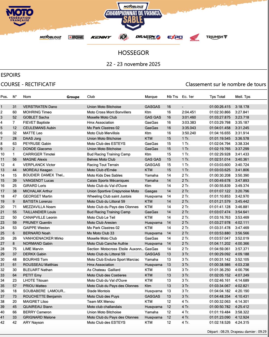 Dano Verstraeten heeft een sterke wedstrijd gereden bij het Frans zandkampioenschap 85cc in Hossegor. In de 1 uur durende wedstrijd wist Verstraeten een voorsprong van meer dan twee minuten op te bouwen ten opzichte van de tweede man, Timeo Mohring. Achter Verstraeten en Mohring werd Sacha Goblet derde voor Baptiste Fievet en Aubin Ceulemans.