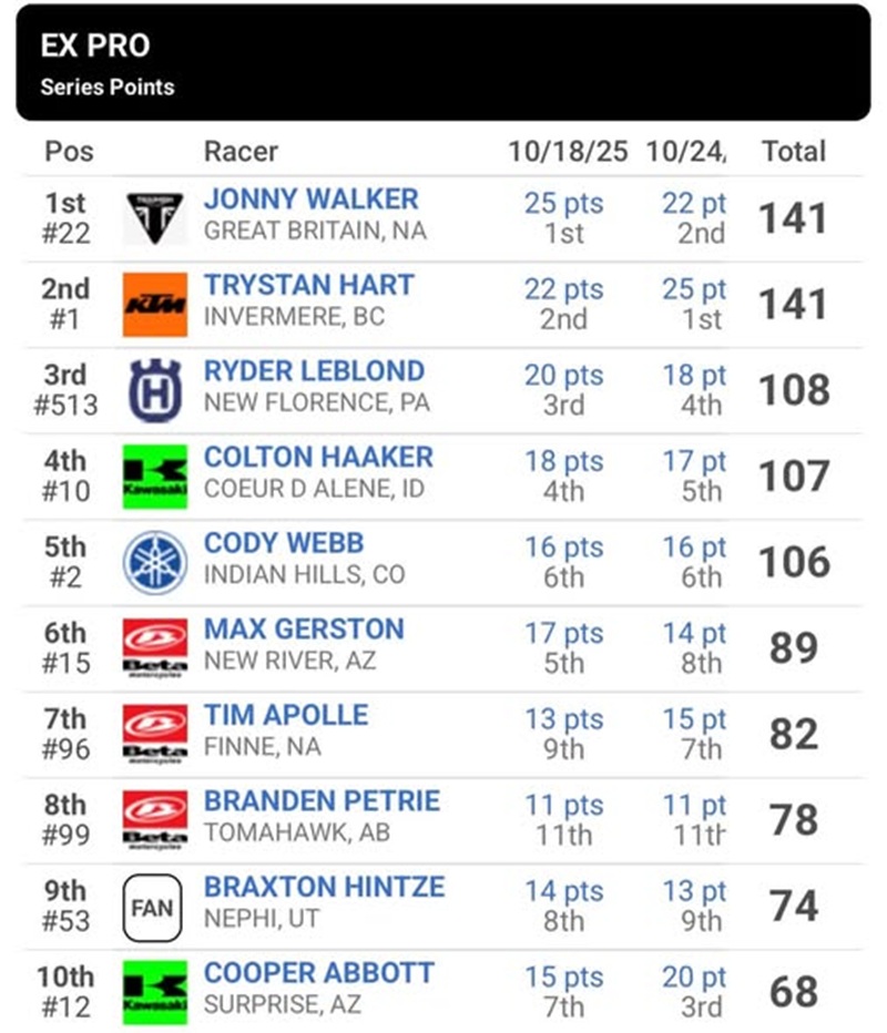 Hart eindigde als tweede overall, gevolgd door Ryder Leblond op de derde plaats.