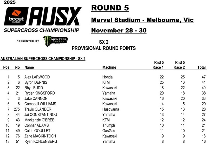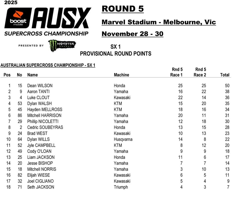 Kingsford en Wilson pakken Australische SX titels by motocrossplanet29 november 2025 Ryder Kingsford en Dean Wilson hebben de Australische Supercrosstitels in de wacht weten te slepen. Bekijk hieronder de uitslagen van de laatste wedstrijd in Adelaide: