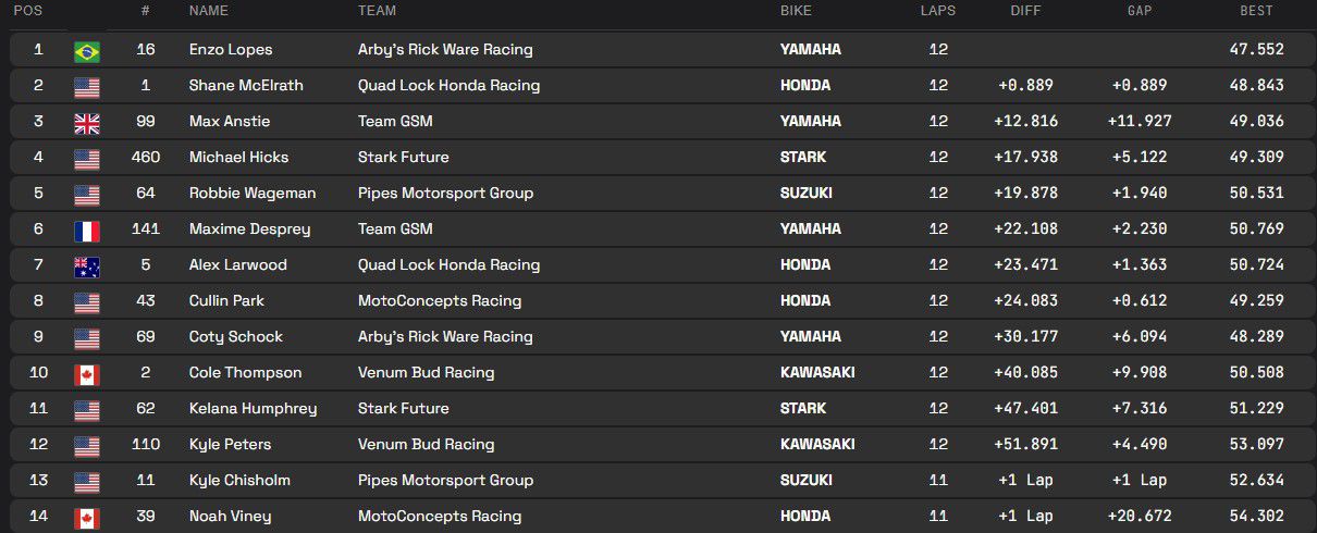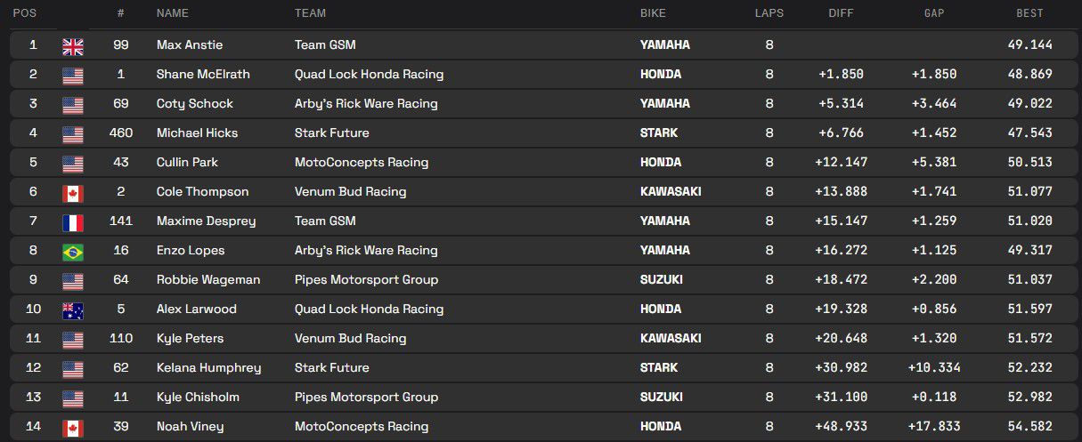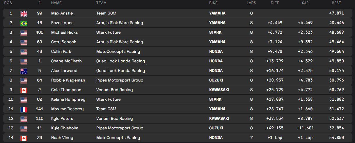 Anstie wist twee van de drie manches te winnen. Enkel in de finale moest hij de zege aan Enzo Lopes laten en werd achter Shane McElrath derde.