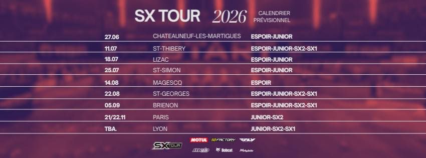 Kalender Franse SX Tour 2026 bekend by motocrossplanet12 december 202512 december 2025 De bekende Franse SX Tour heeft haar kalender voor seizoen 2026 bekend gemaakt. Het kampioenschap zal bestaan uit negen wedstrijden en loopt van eind juni tot december. Bekijk de kalender hieronder: