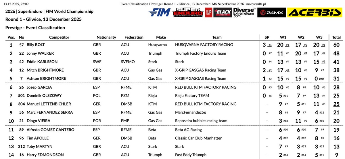 Billy Bolt eerste leider in het WK Superenduro by motocrossplanet13 december 202513 december 2025 Billy Bolt heeft de eerste wedstrijd van het wereldkampioenschap superenduro in Polen gewonnen. Bolt werd 1-2-1 in de manches en pakte hiermee de eindzege voor Jonny Walker en Eddie Karlsson.