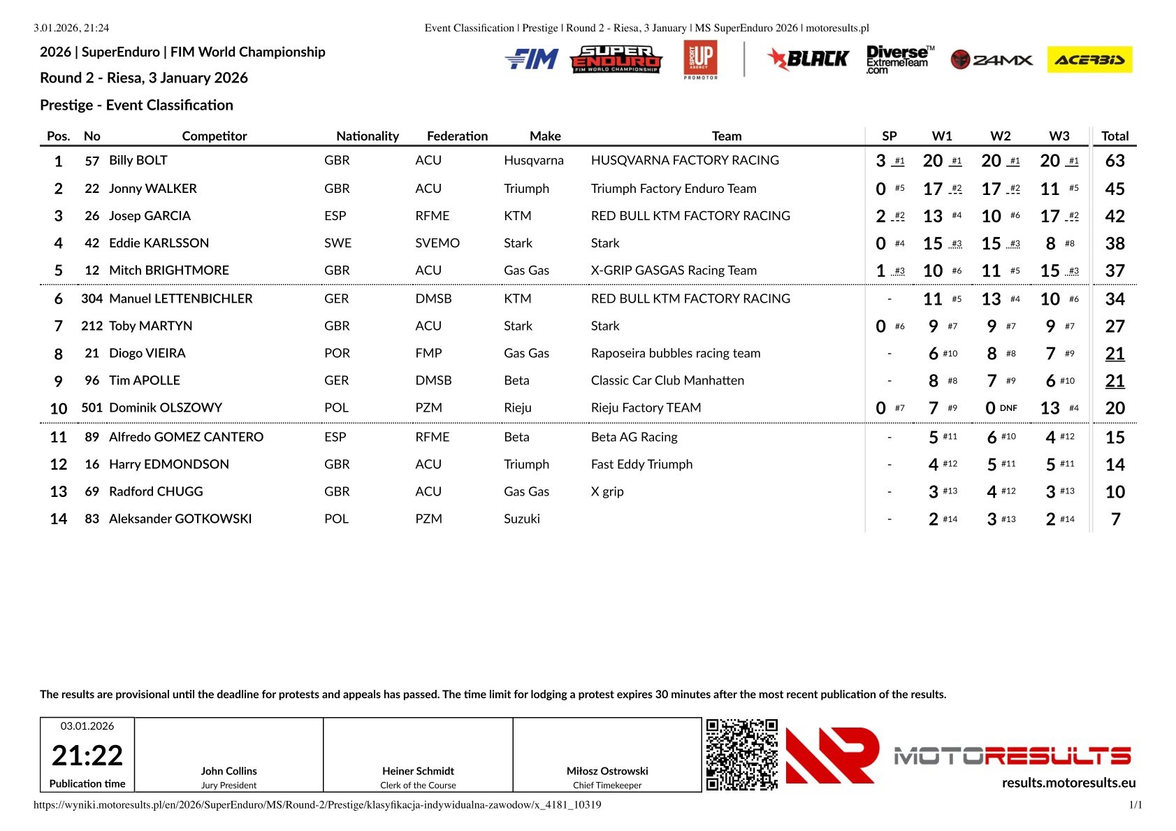Jonny Walker werd tweede met een 2-2-5 in de manches en Josep Garcia pakte met een 4-6-2 zijn eerste podiumplaats in het wereldkampioenschap superenduro. Eddie Karlsson reed sterk in de eerste twee manches en werd beide keren derde. Omdat hij in de derde manche niet verder kwam dan een achtste plaats miste hij net het podium en werd nu vierde voor Mitchel Brightmore!