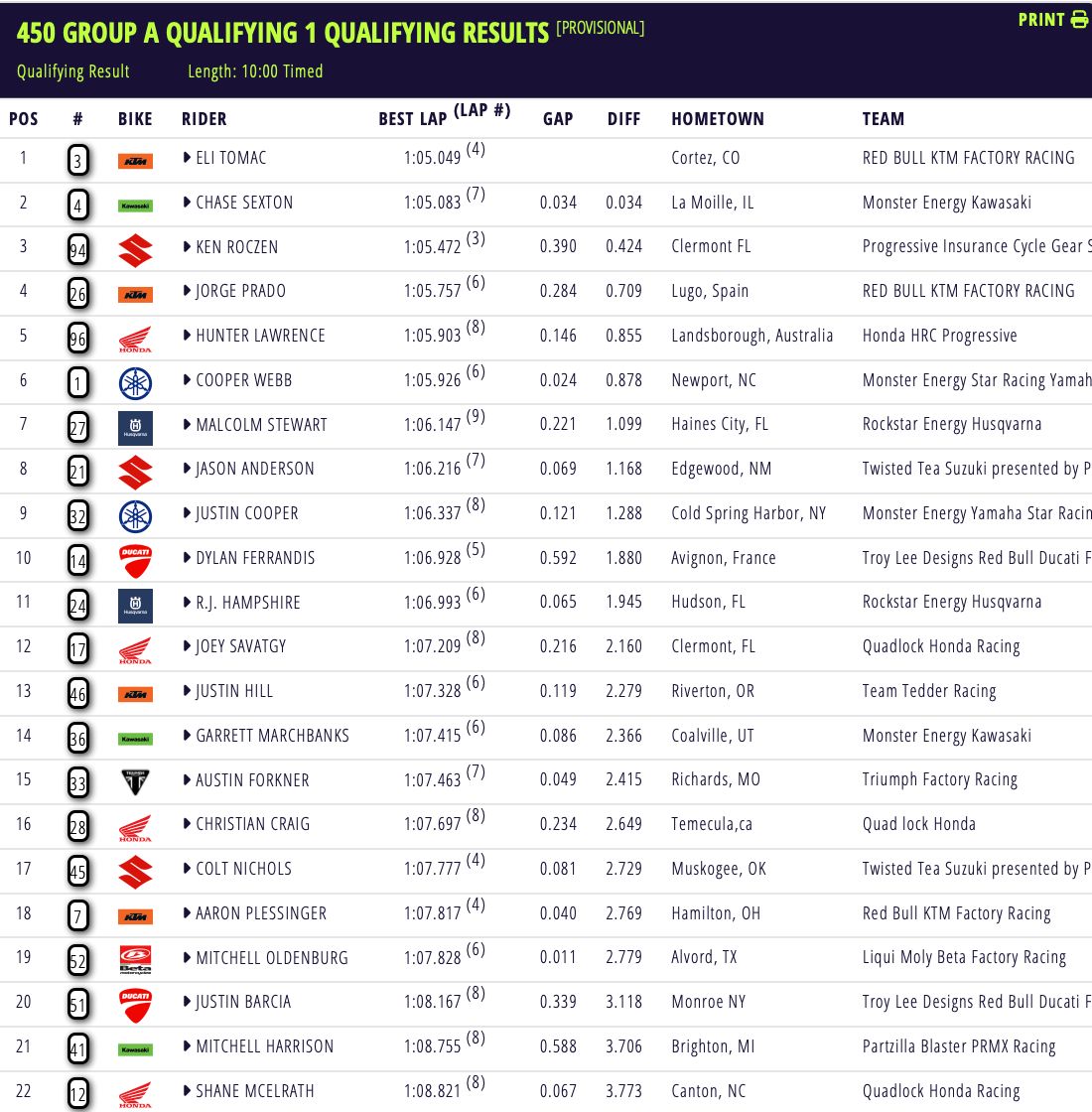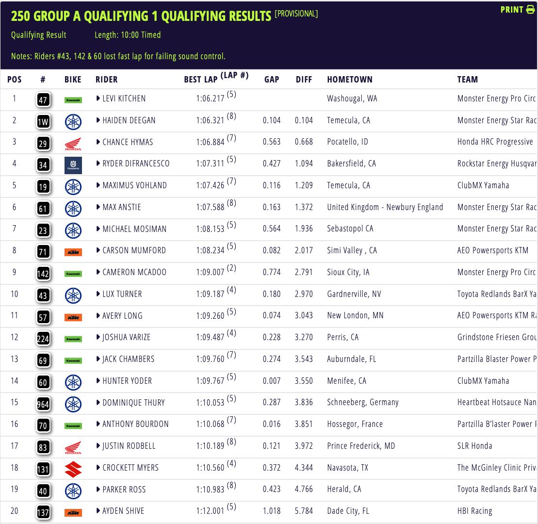 Eli Tomac en Levi Kitchen hebben in de eerste kwalificatie van het AMA Supercross Kampioenschap in Anaheim de snelste tijd op de klok weten te zetten. Achter Tomac was Chase Sexton tweede in de 450 klasse voor Ken Roczen. Ook Jorge Prado was snel met een vierde tijd voor Hunter Lawrence.