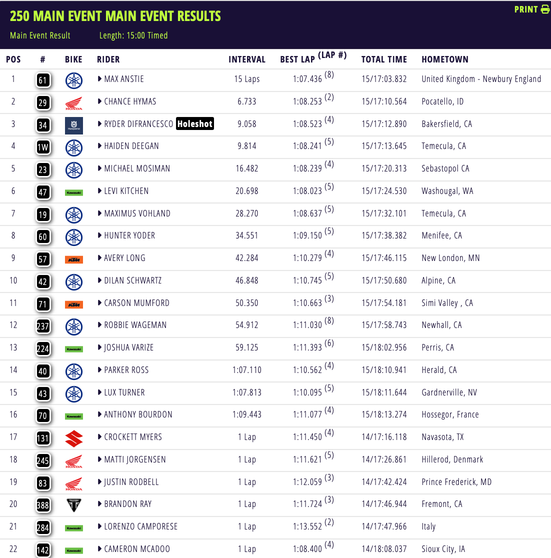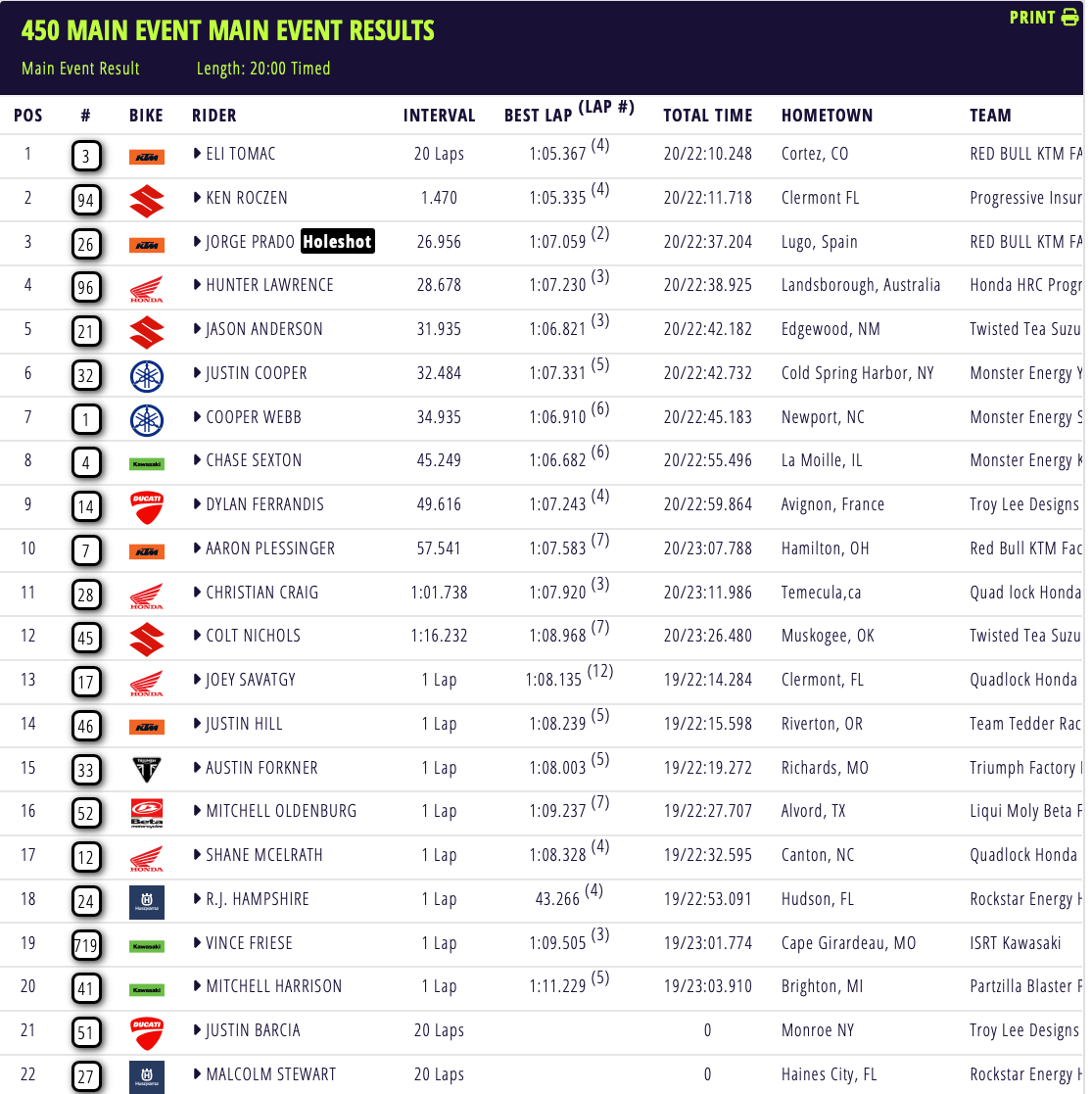 Tomac en Anstie winnen in Anaheim by motocrossplanet11 januari 202611 januari 2026 Eli Tomac en Max Anstie hebben de eerste wedstrijd van het Amerikaans Kampioenschap Supercross in Anaheim weten te winnen. Bekijk de volledige uitslagen hieronder: