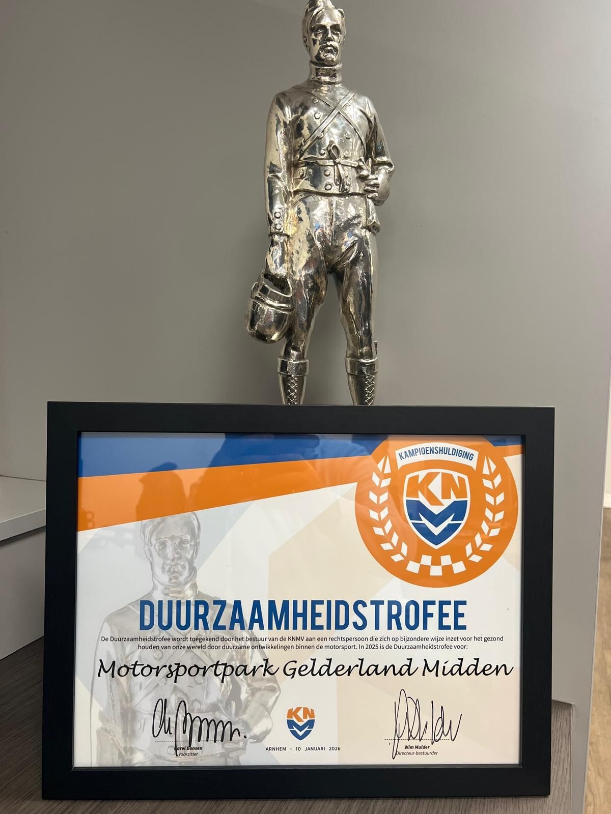 Tijdens de KNMV kampioenshuldiging heeft Motorsportpark Gelderland Midden met trots de duurzaamheidsprijs in ontvangst mogen nemen. Een mooie erkenning voor onze inzet op het gebied van duurzaamheid binnen de motorsport. We zijn trots op deze waardering en blijven ons inzetten voor een toekomstbestendig en verantwoord motorsportpark.