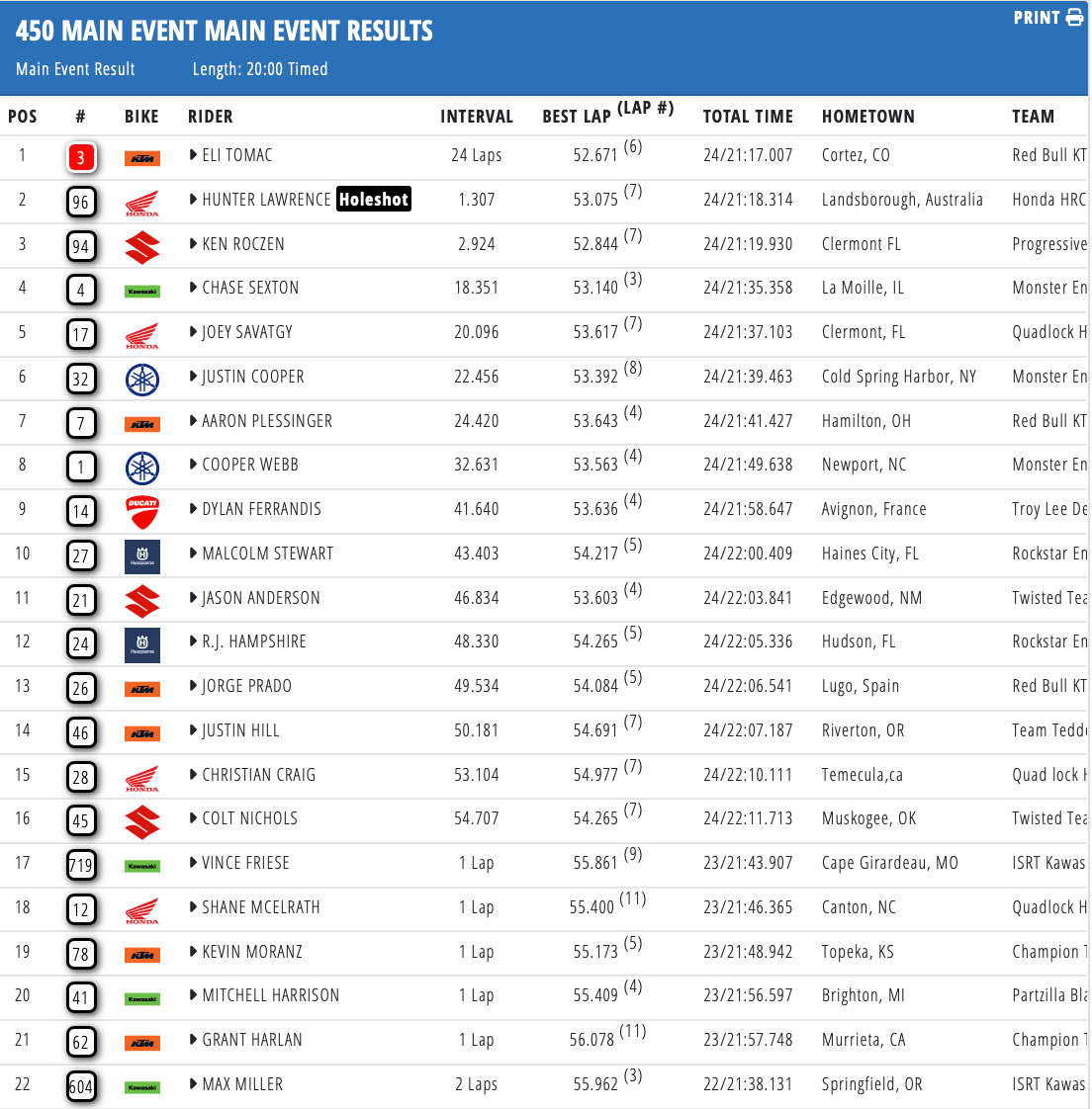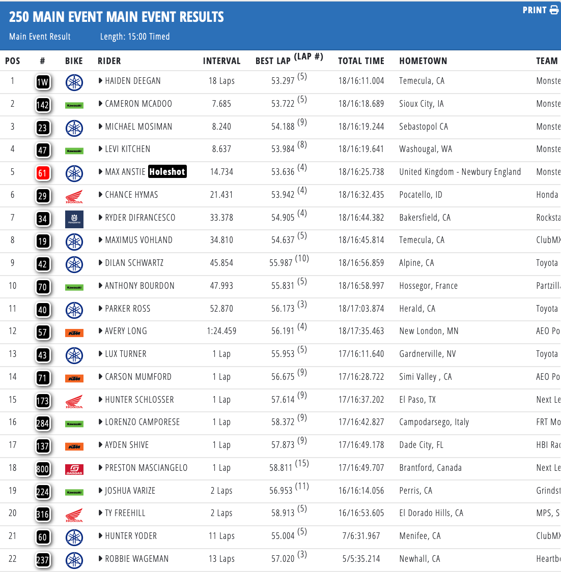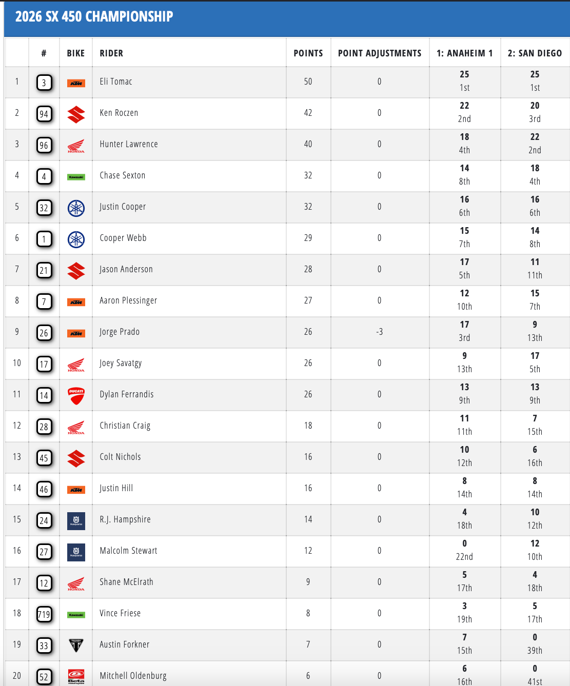 Tomac en Deegan winnen Supercross in San Diego by motocrossplanet18 januari 2026 Haiden Deegan en Eli Tomac hebben de tweede wedstrijd van het Amerikaans Supercross Kampioenschap in San Diego weten te winnen. Bekijk hieronder de uitslagen en de nieuwe tussenstand: Photocredits – Align Media
