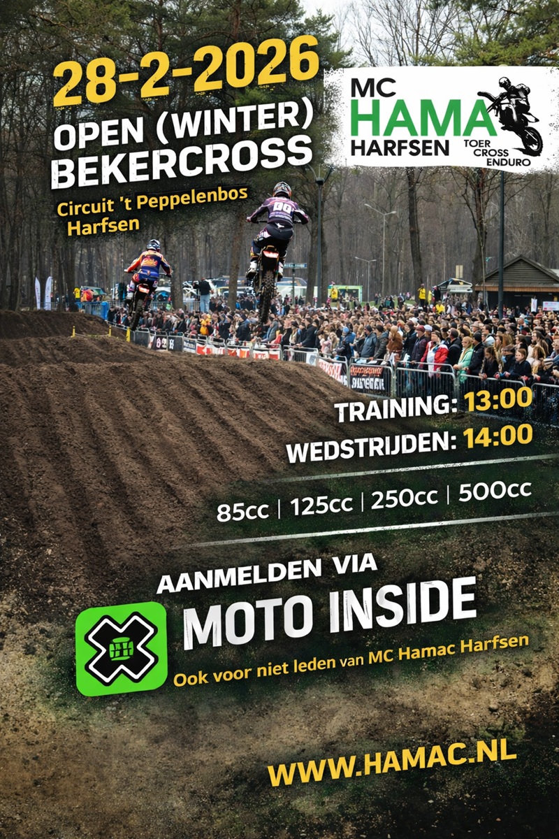 Op zaterdag 28-2-2026 organiseren wij een open bekercross. Een unieke kans om als niet lid van MC Hamac toch een keer een wedstrijd bij ons te rijden.
