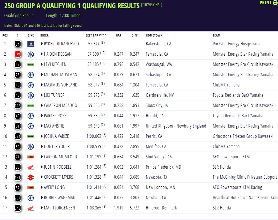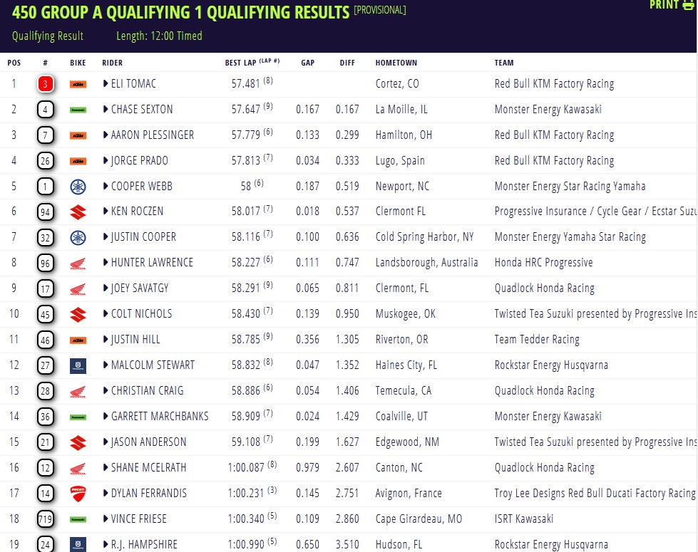 DiFrancesco en Tomac snelste in eerste kwalificatie Glendale by motocrossplanet7 februari 20267 februari 2026 Ryder DiFrancesco en Eli Tomac hebben in de eerste kwalificatie van de Supercross in Glendale de snelste tijd op de klok weten te zetten. Bekijk hieronder de tijden: Photocredits – Align Media