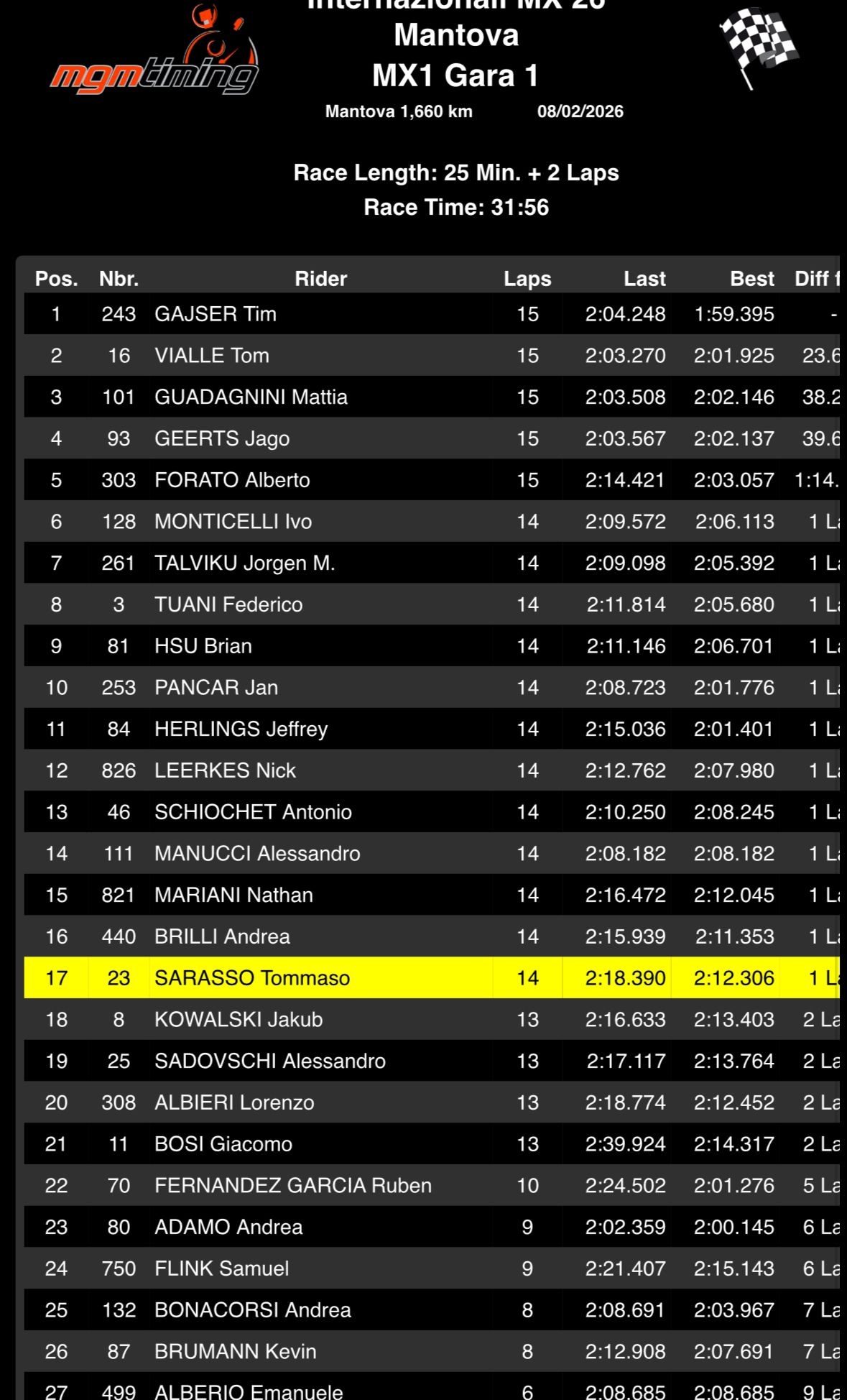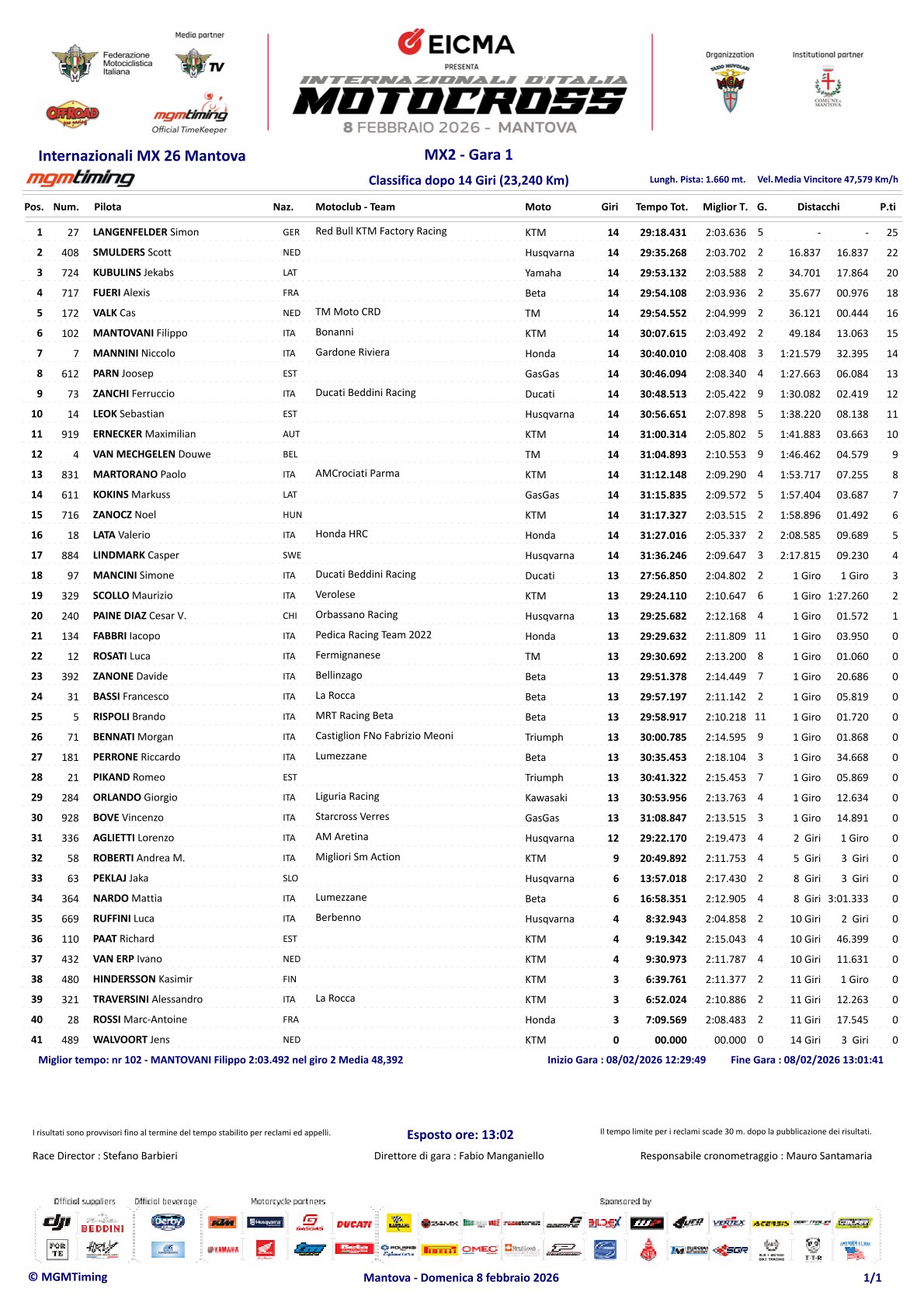 Jeffrey Herlings is in de eerste manche van het Italiaans Kampioenschap in Mantova tot stilstand gekomen. Herlings nam een goede start maar belandde in een gevecht met Tim Gajser buiten de baan in de tweede bocht. Hierbij gingen verschillende posities verloren maar gedurende de wedstrijd kwam hij terug naar een vierde plaats en kreeg de aansluiting met Ruben Fernandez. Echter in het midden van de wedstrijd kwam hij tot stilstand in een bocht door een probleem met de ketting. Hierbij gingen vele plaatsen verloren waardoor een top drie resultaat uitgesloten is.