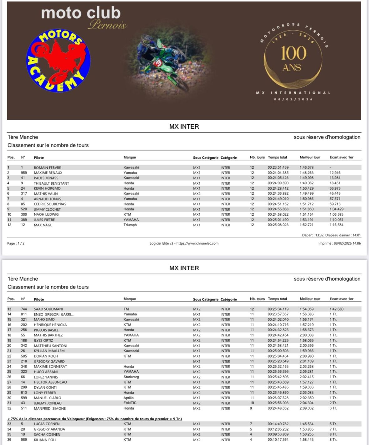 Febvre wint eerste manche in Pernes by motocrossplanet8 februari 2026 Romain Febvre heeft de eerste manche van de internationale wedstrijd in het Franse Pernes les Fontaines weten te winnen voor Maxime Renaux en Pauls Jonass. Lucas en Sacha Coenen haalden de finish niet. Photocredits – CDS Images