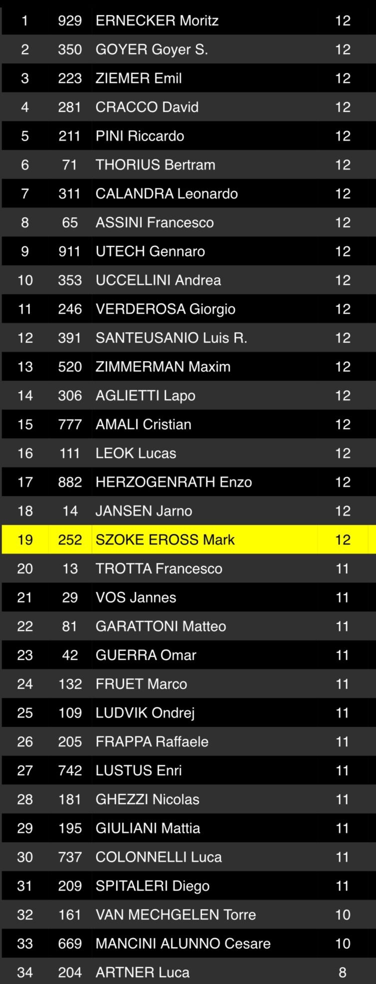 Jannes Vos eindigde met een 21ste plaats net buiten de top 20 en Torre van Mechgelen werd 32ste. Timo Heuver haalde de finish niet.