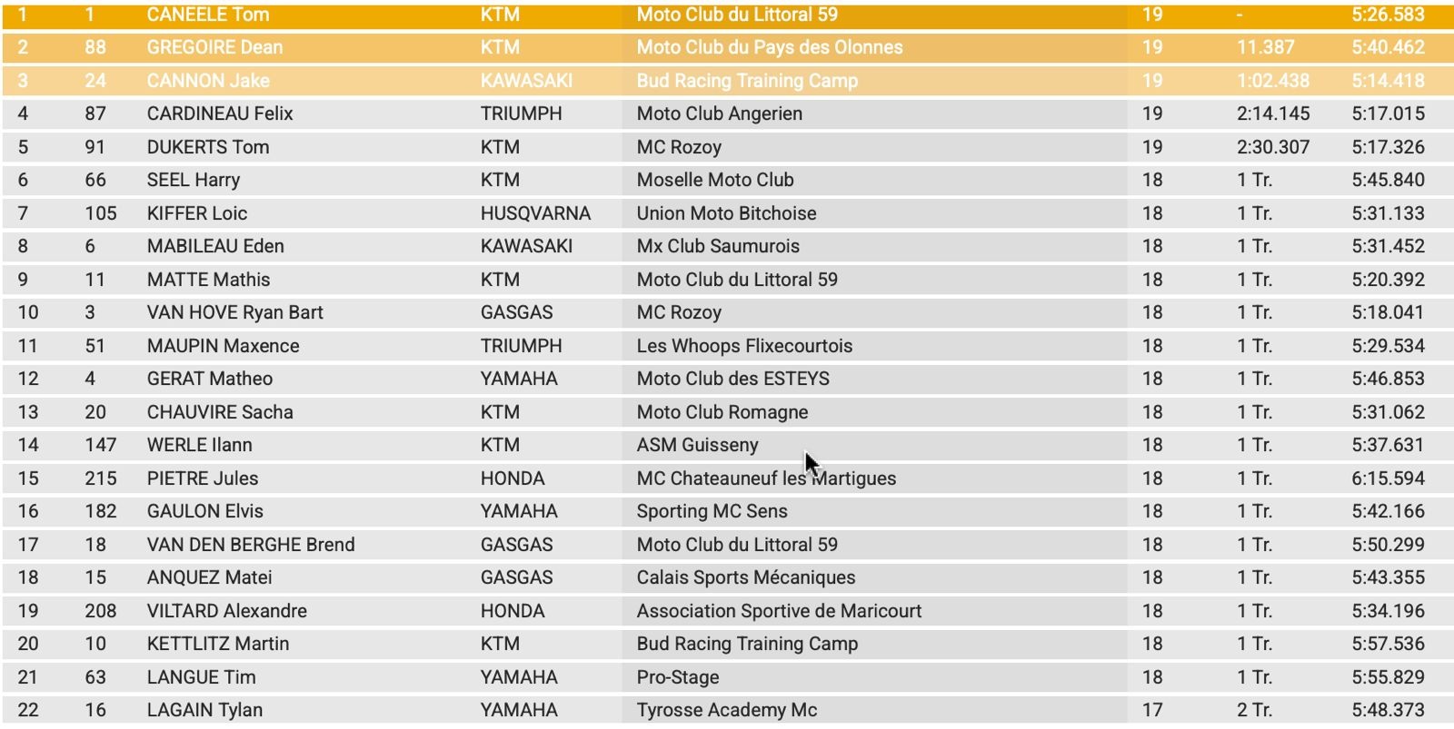 Jake Cannon van BUD Racing Kawasaki werd derde voor Felix Cardineau en Tom Dukerts. De Belg Harry Seel werd zesde en Ryan Bart van Hove legde beslag op een tiende.