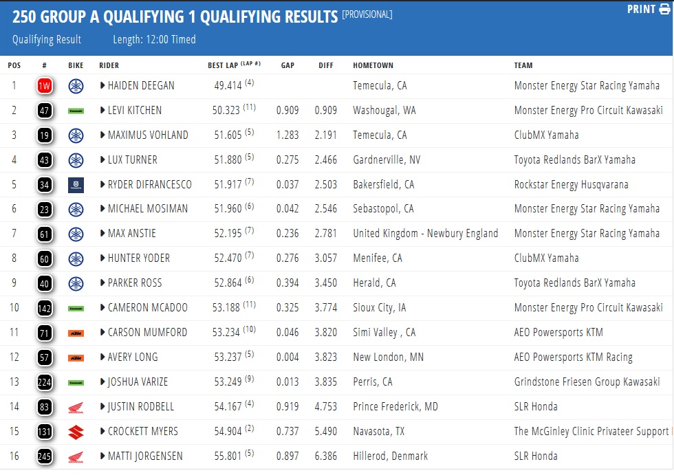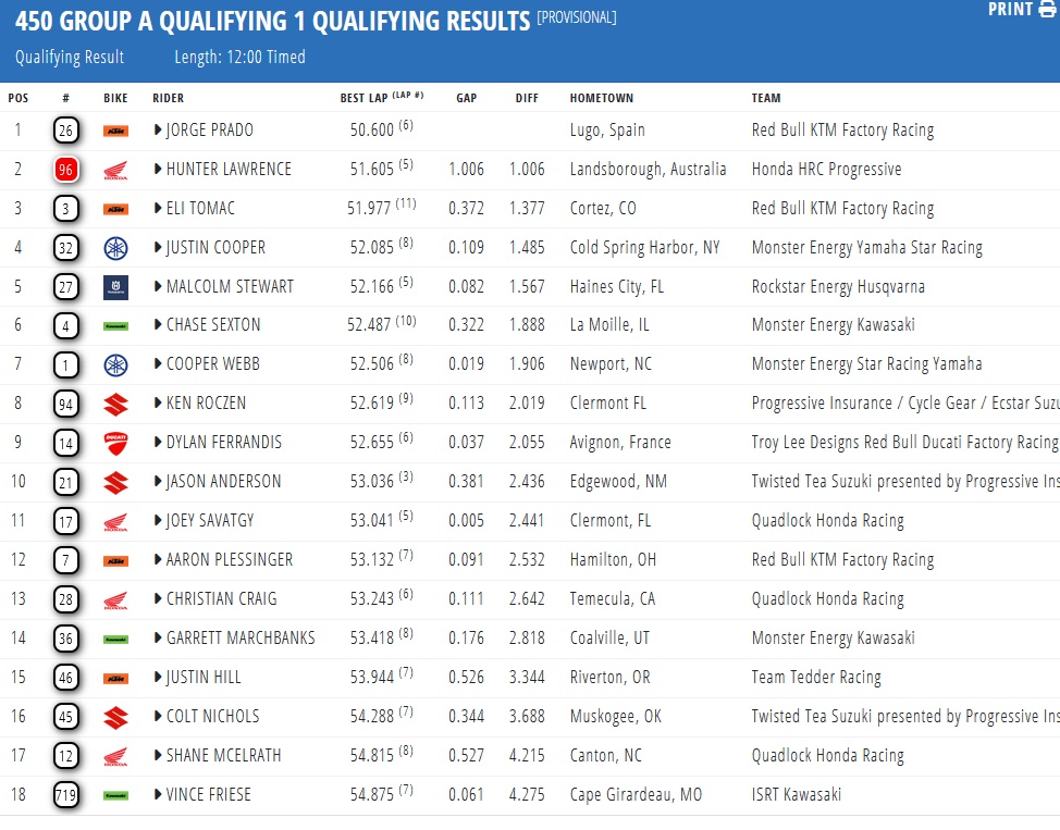 Prado en Deegan snelste in eerste kwalificatie Seattle by motocrossplanet14 februari 202614 februari 2026 Jorge Prado en Haiden Deegan hebben in de eerste kwalificatie van de Supercross in Seattle de snelste tijden op de klok weten te zetten. Bekijk hieronder de tijden: Photocredits – Align Media