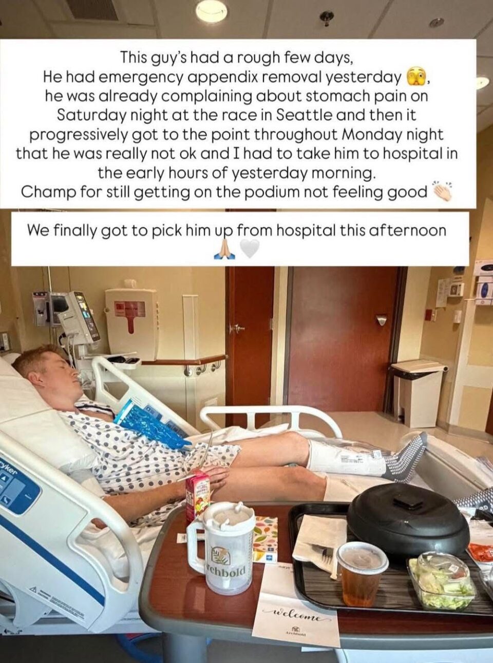 Een kampioen dat hij toch nog het podium wist te halen terwijl hij zich niet goed voelde. Vanmiddag mochten we hem eindelijk weer ophalen uit het ziekenhuis.”