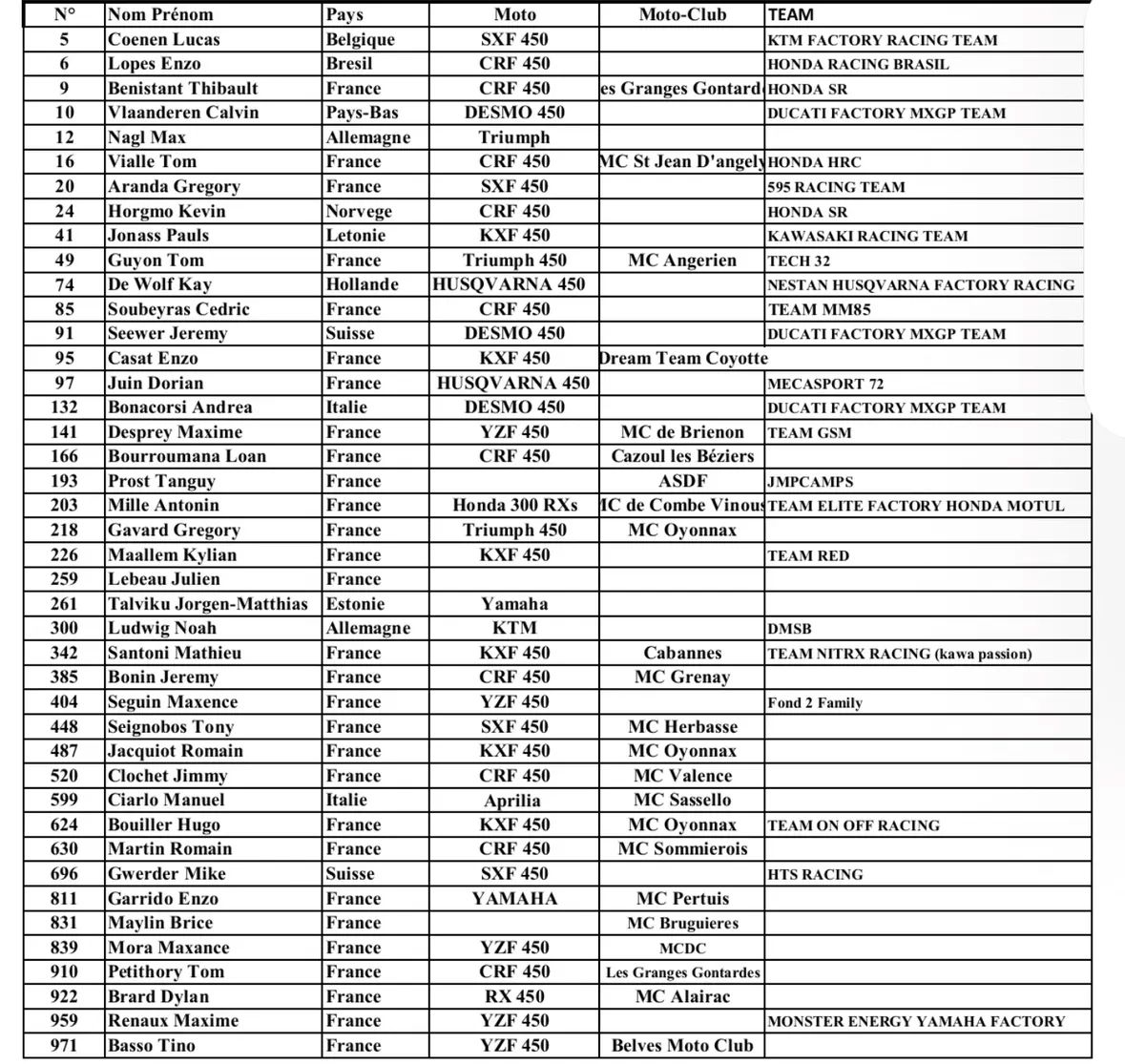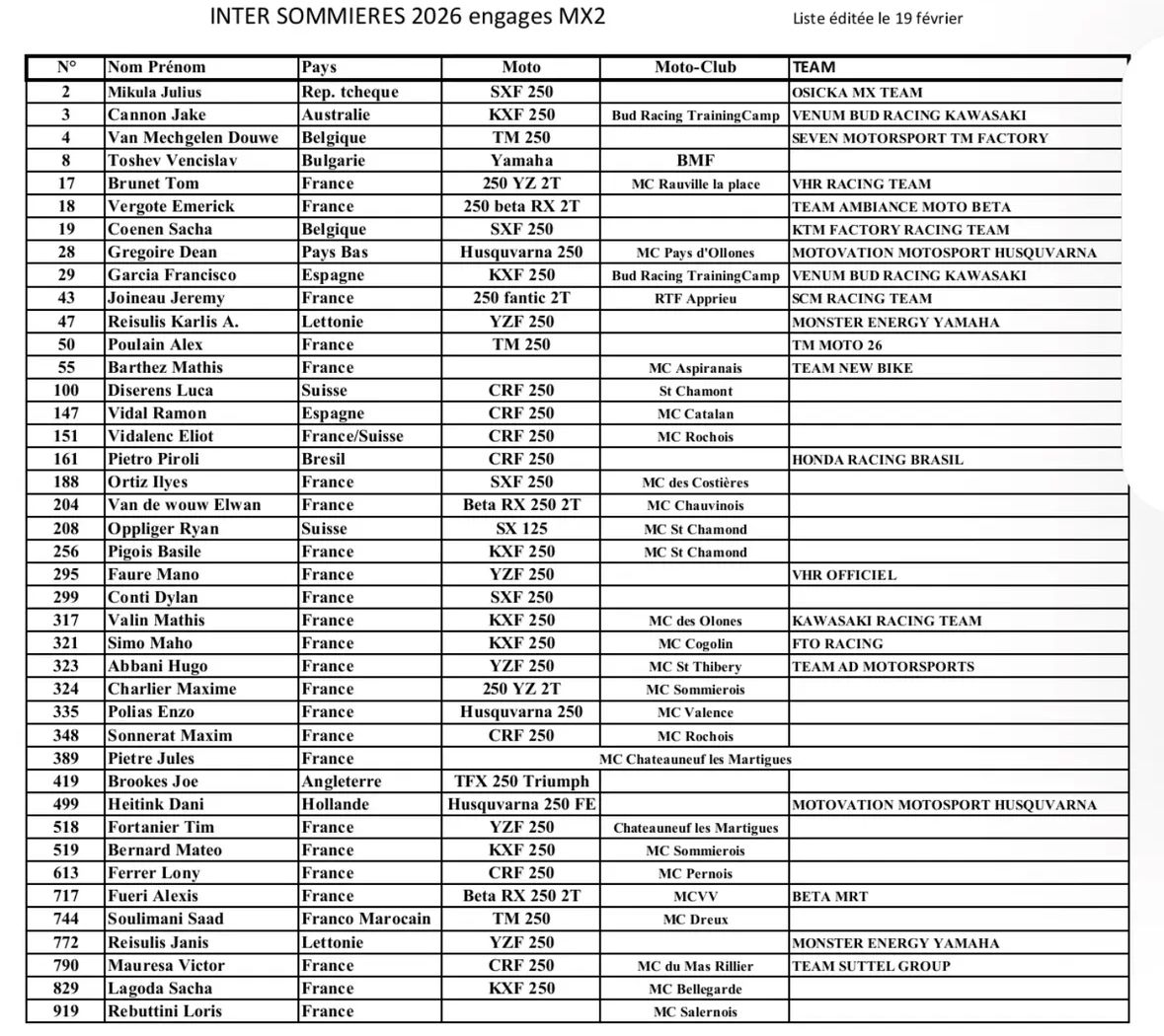 Deelnemerslijsten int.wedstrijd Sommieres bekend by motocrossplanet19 februari 202619 februari 2026 Aankomend weekend wordt er in het Franse Sommieres een grote internationale wedstrijd verreden. Verschillende grote namen gaan hier van start om zich voor te bereiden op het naderende seizoen. Bekijk de deelnemerslijsten hieronder: Photographer: Bavo Swijgers