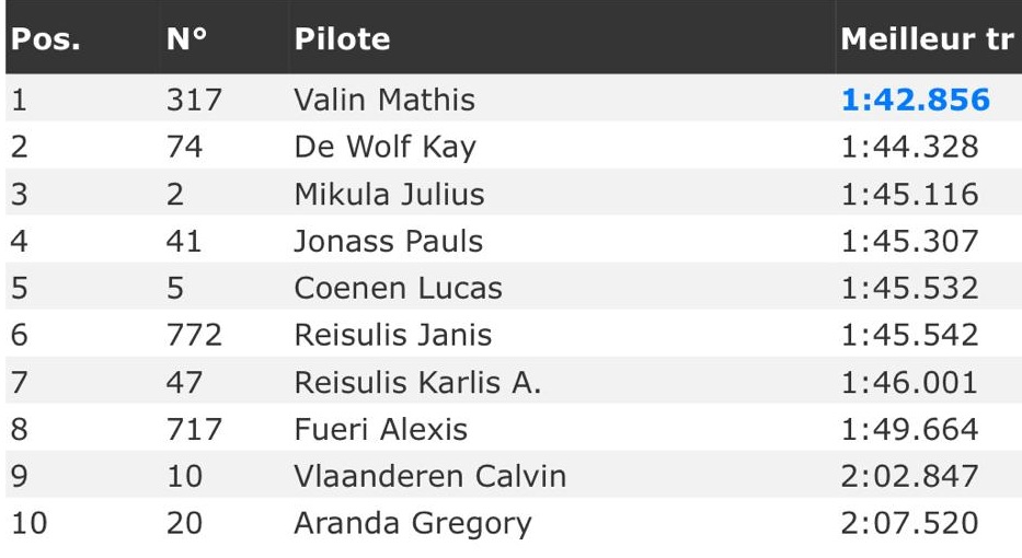 Kay de Wolf had lange tijd de snelste tijd in handen maar Valin was als laatste en perste er een hele snelle ronde uit. Valin was 1.4 sec sneller dan de Wolf en 2.3 sec sneller dan derde man Julius Mikula. Pauls Jonass en Lucas Coenen kwamen uit op de vierde en vijfde tijd.