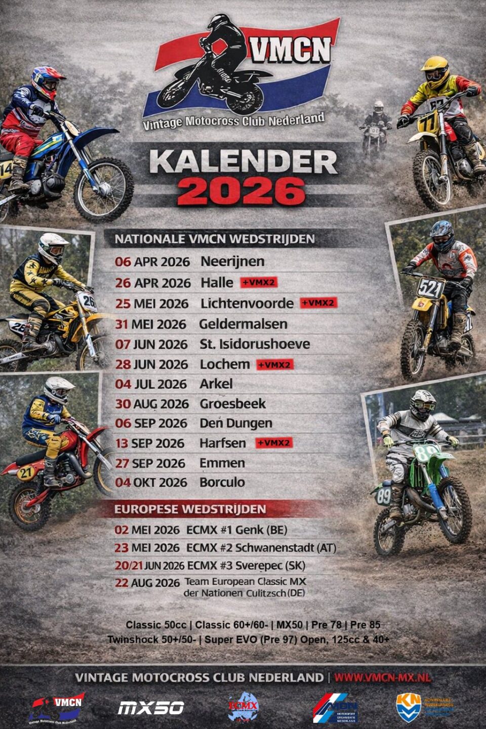 De kalender voor seizoen 2026 is bekend, en die is goed gelukt. Maar liefst 12 wedstrijden op prachtige circuits, verdeelt over heel Nederland. Naast alle vintage klassen die op een wedstrijddag aan de start komen heeft de VMCN de VMX2 klasse toegevoegd op 4 wedstrijden.