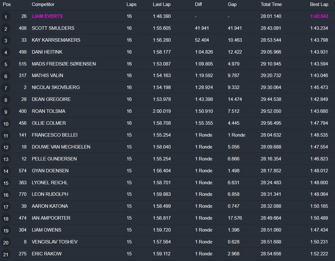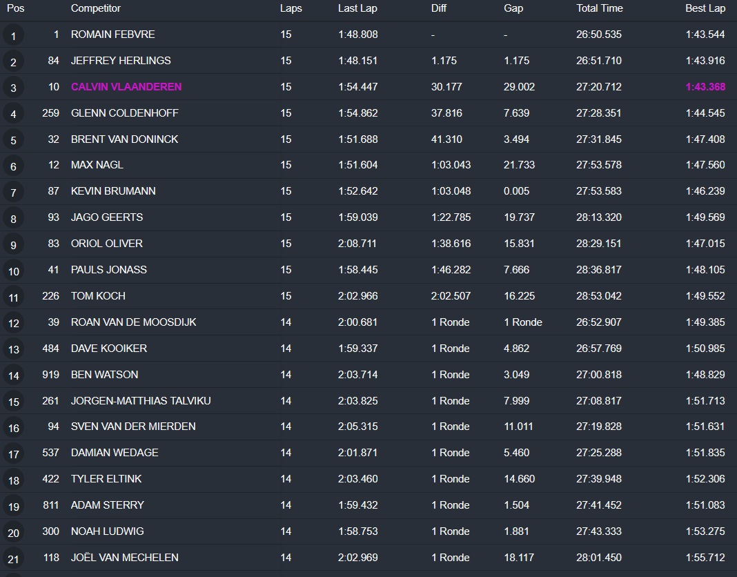 Everts en Febvre winnen eerste manche in Lierop by motocrossplanet1 maart 2026 Liam Everts en Romain Febvre hebben de eerste manche van de internationale wedstrijd in Lierop gewonnen. Bekijk hieronder de uitslagen: Bekijk deze live race op MYLAPS #Speedhive https://speedhive.mylaps.com/livetiming/430971250CDCE3FE-2147483649 250: Photocredits – Full Spectrum Media