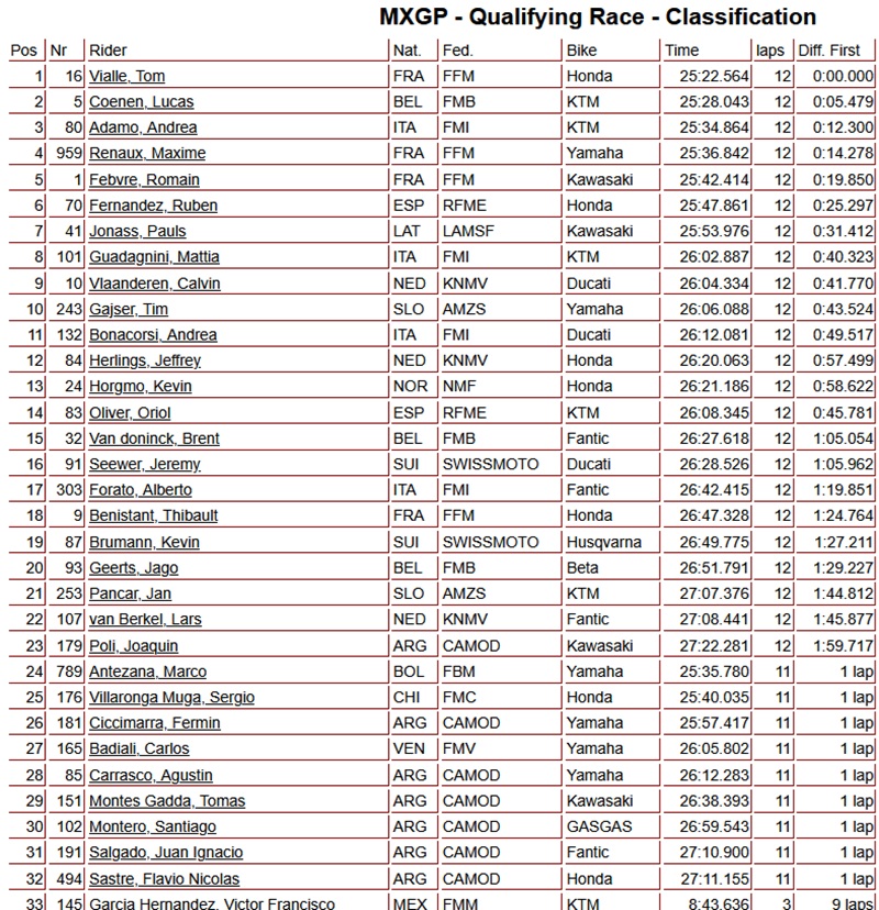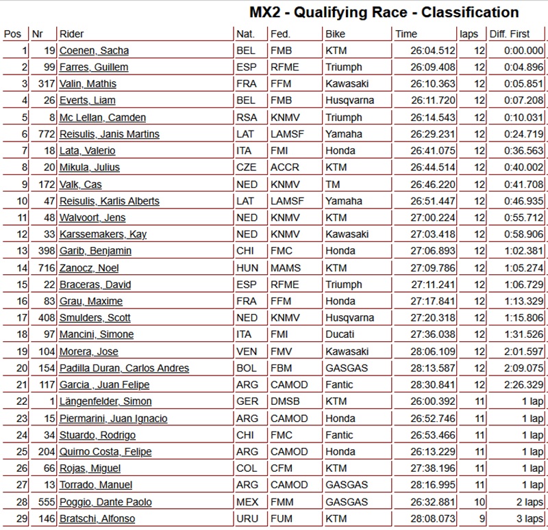 In de MX2-klasse was het Sacha Coenen die de kwalificatierace wist te winnen. Met deze overwinning begint hij zondag vol vertrouwen aan de Grand Prix.