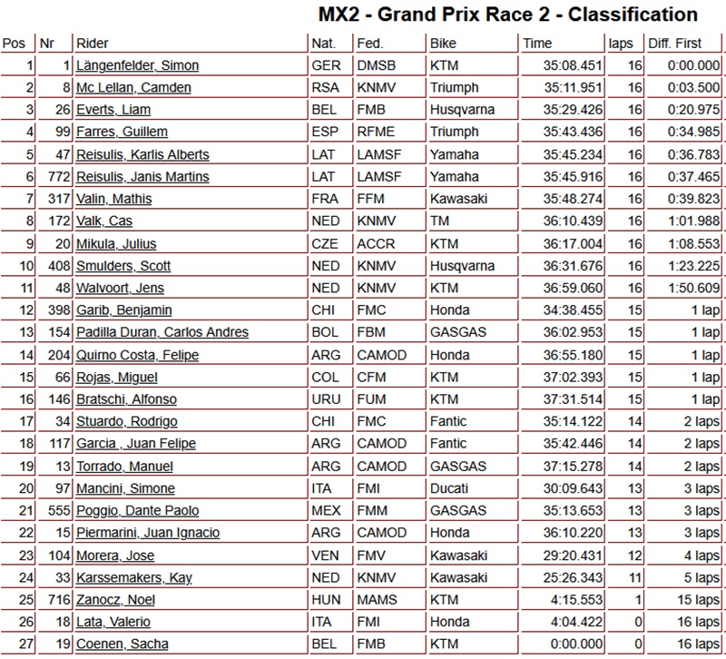 Simon Längenfelder heeft ook de tweede MX2-manche gewonnen tijdens de 2026 YPF MXGP of Argentina. Hij eindigde voor Camden McLellan en Liam Everts.