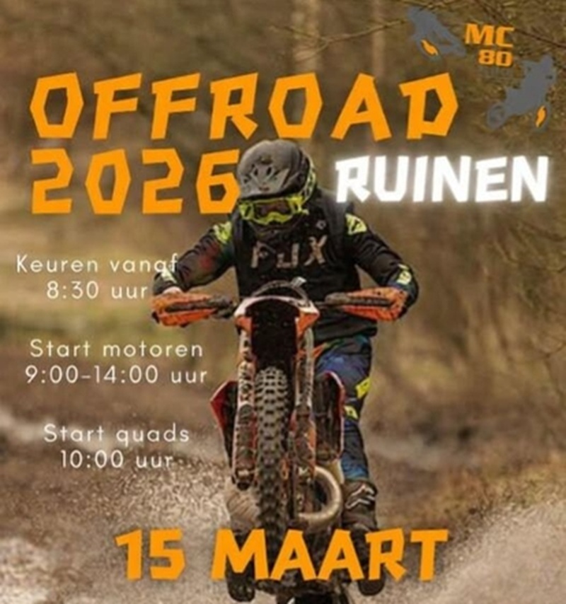 Dit weekend wordt de offroadrit van MC80 in Ruinen verreden. Op zondag 15 maart zal de circa 55 kilometer lange rit voor de liefhebbers opengesteld zijn! Het is alweer de 40e editie voor MC80.