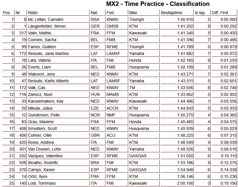 In de MX2-klasse was het Camden Mc Lellan die de snelste ronde klokte. Simon Längenfelder volgde op de tweede plaats en Mathis Valin sloot de top drie af.