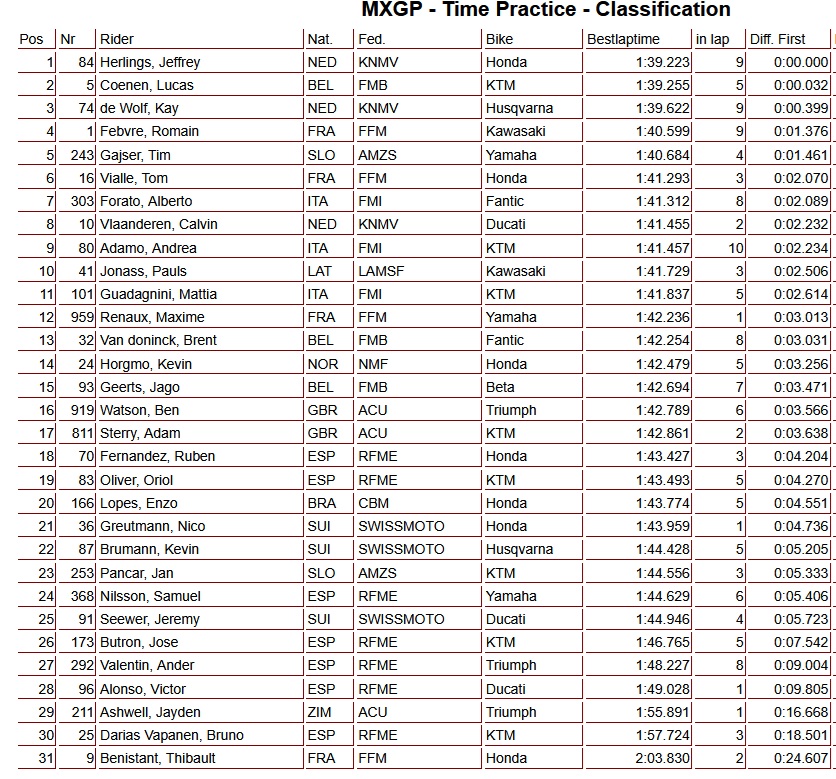 Jeffrey Herlings heeft de snelste tijd neergezet in de tijdtraining van de MXGP-klasse tijdens de Grand Prix van Spanje. Lucas Coenen eindigde als tweede, gevolgd door Kay de Wolf op de derde plaats. Romain Febvre werd vierde, terwijl Tim Gajser de vijfde tijd noteerde.