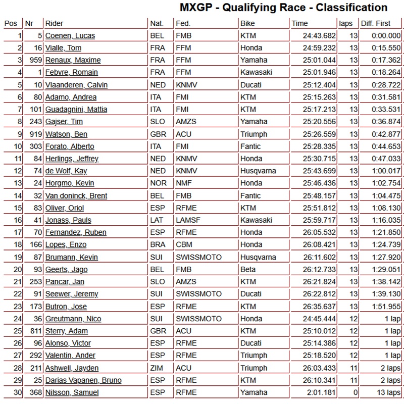 Lucas Coenen heeft de kwalificatiewedstrijd van de MXGP-klasse in Spanje op zijn naam geschreven. Hij bleef Tom Vialle en Maxime Renaux voor, die respectievelijk als tweede en derde finishten.
