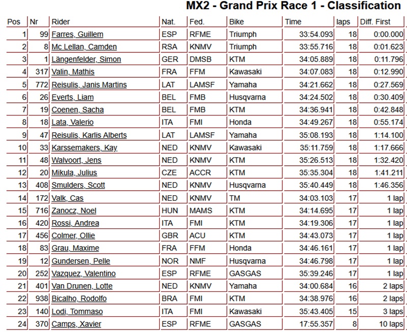 Farres heeft de eerste manche van de MX2 in Spanje op zijn naam geschreven. Hij wist Mc Lellan en Langenfelder achter zich te houden en pakte overtuigend de overwinning.