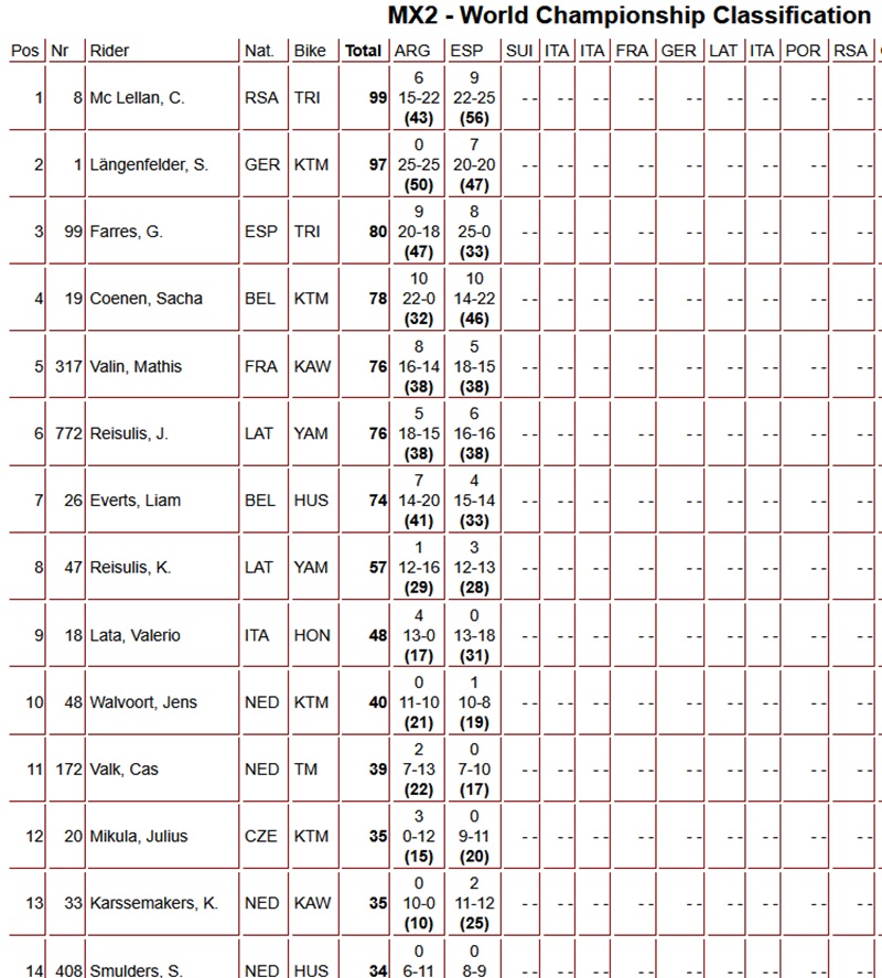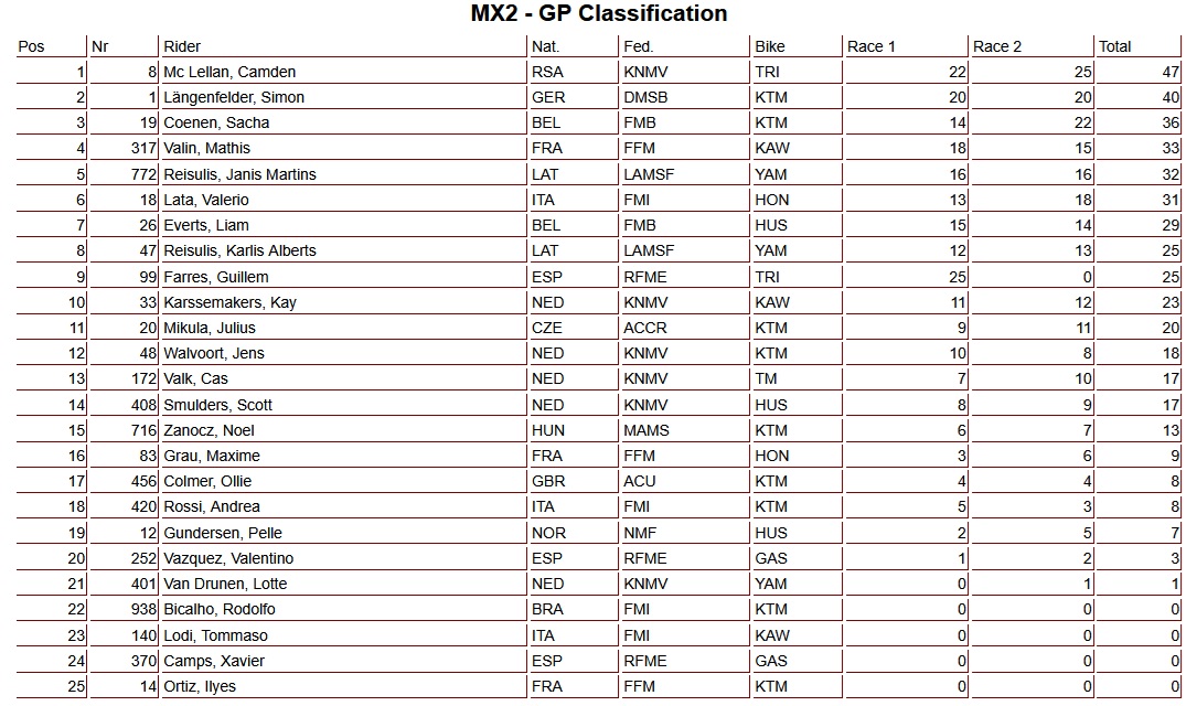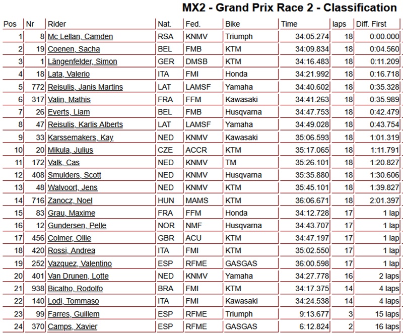 Camden Mc Lellan heeft de tweede manche van de MX2 gewonnen en daarmee ook de Grand Prix op zijn naam geschreven. Sacha Coenen eindigde als tweede, gevolgd door Langenfelder op de derde plaats, terwijl Lata als vierde finishte.