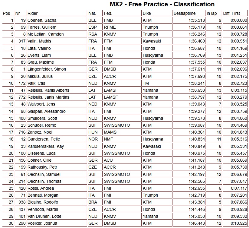 In de MXGP-categorie eindigde Jeffrey Herlings als tweede, gevolgd door Andrea Adamo op de derde plaats. In de MX2-klasse pakte Guillem Farrés de tweede tijd, terwijl McLellan als derde eindigde.