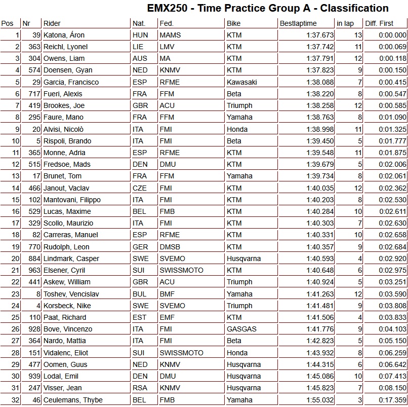 Tijdens de EMX250 tijdtraining in Zwitserland was Aron Katona de snelste in groep A, voor Reichl en Owens, terwijl Cas Valk Doensen de vierde tijd noteerde. Guus Oomen eindigde als 29e en Jean Visser als 31e.
