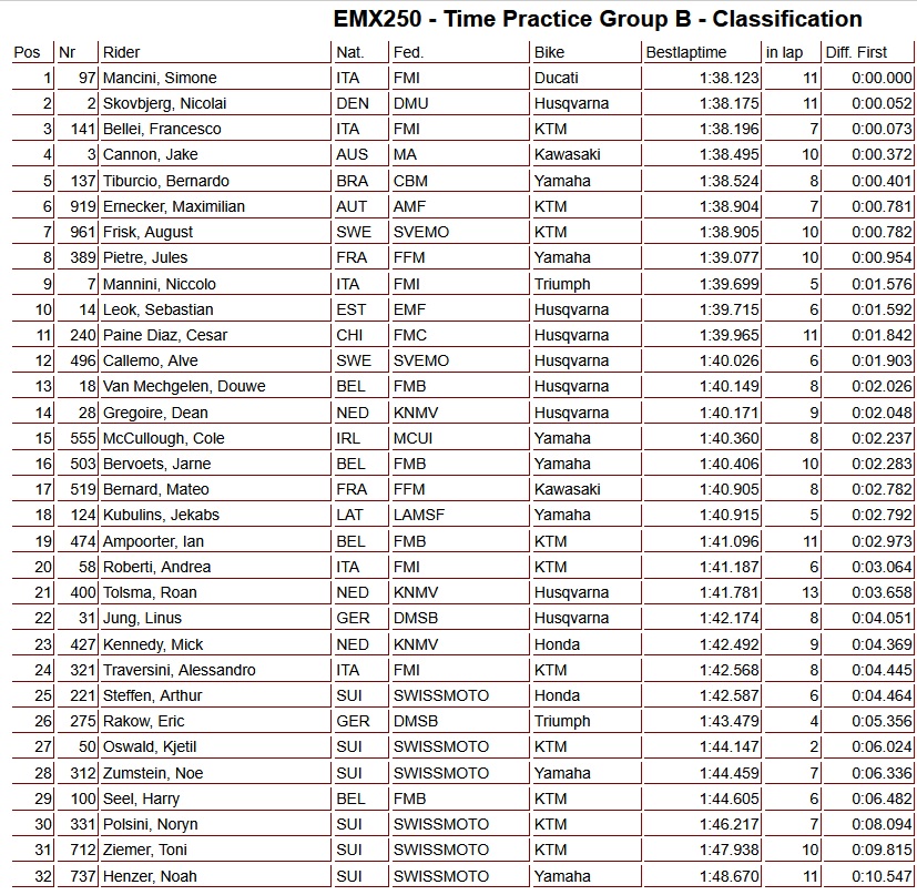 In groep B zette Simone Mancini de snelste tijd neer, gevolgd door Skovbjerg en Bellei. Dean Gregoire werd 14e, Roan Tolsma 21e en Mick Kennedy sloot af als 23e.
