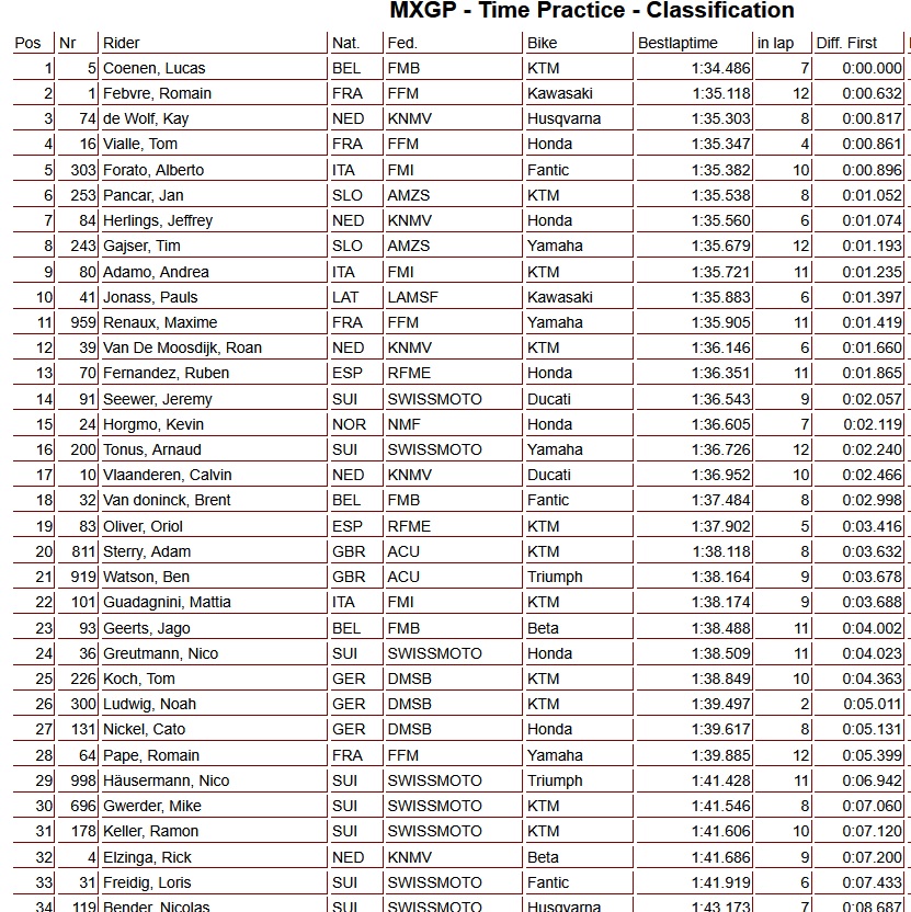 Tijdens de MXGP tijdtraining in Zwitserland zette Lucas Coenen de snelste tijd neer. Romain Febvre volgde als tweede, met Kay de Wolf op de derde plaats. Tom Vialle, Alberto Forato en Jan Pancar maakten de top zes compleet, terwijl Jeffrey Herlings als zevende eindigde. Calvin Vlaanderen werd 17e en Rick Elzinga noteerde de 32e tijd.
