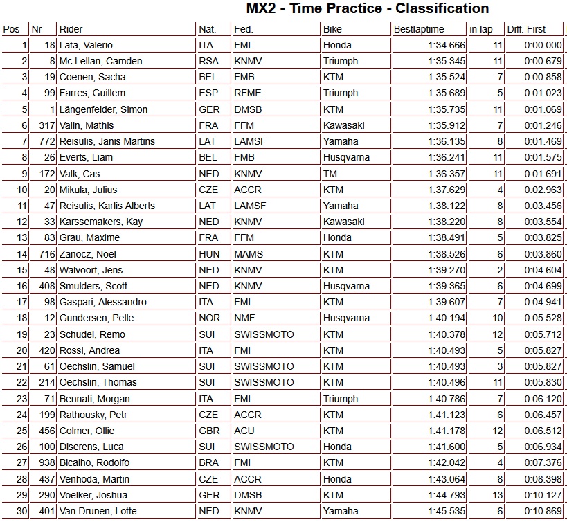 In de MX2-klasse was Valerio Lata het snelst, voor Camden McLellan en Sacha Coenen. Cas Valk eindigde als negende, gevolgd door Kay Karssemakers (12e), Jens Walvoort (15e) en Scott Smulders (16e). Lotte van Drunen sloot af met de 30e tijd.