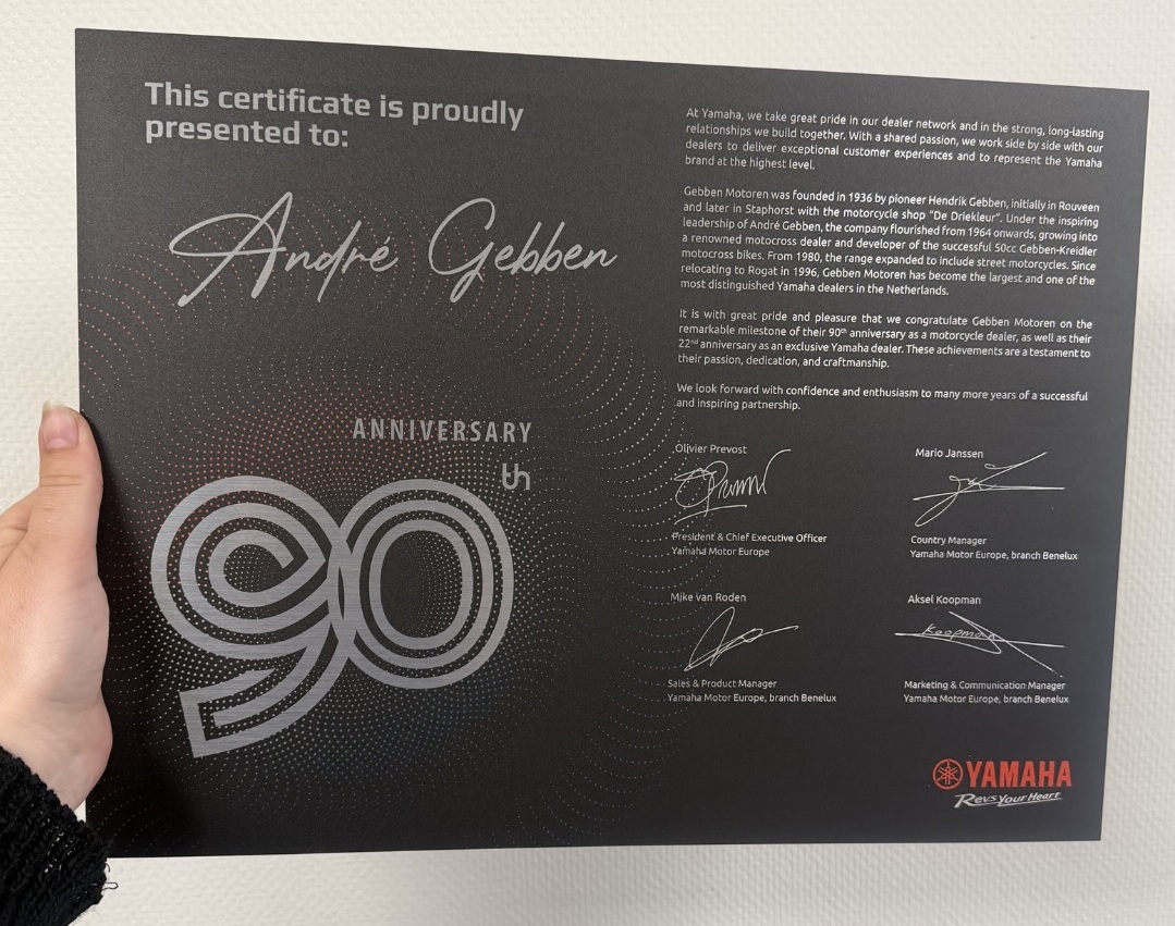 Vandaag, precies 90 jaar geleden, op 2 april 1936 is Gebben Motoren opgericht door Hendrik Gebben in Rouveen. Wat begon als een kleine motorzaak, is uitgegroeid tot de grootste Yamaha exclusief dealer van Nederland.