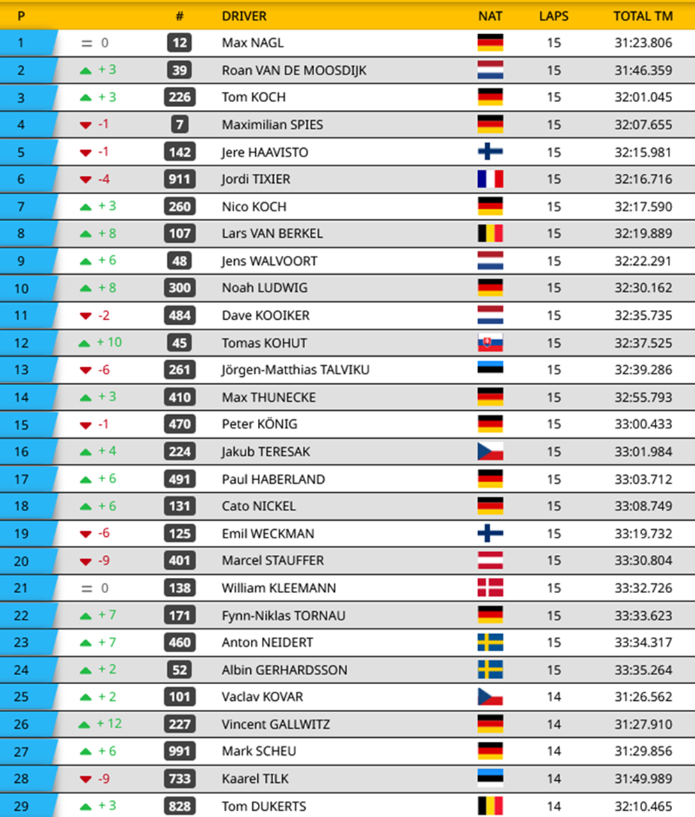 Max Nagl heeft de eerste manche van de ADAC Masters Series in Grevenbroich weten te winnen voor Roan van de Moosdijk en Tom Koch. Max Spies wist als vierde te finishen voor Jordi Tixier en Jere Haavisto.