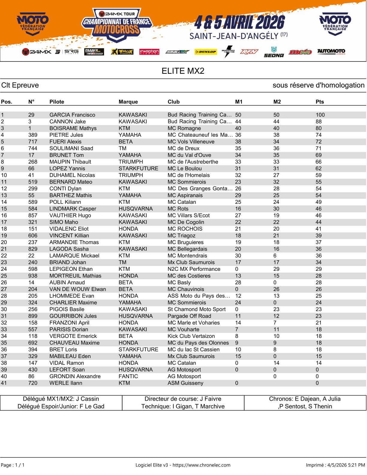 Horgmo en Garcia winnen Frans Kampioenschap St. Jean by motocrossplanet5 april 2026 Kevin Horgmo en Francisco Garcia hebben de tweede wedstrijd van het Frans Kampioenschap in St. Jean d’Angely gewonnen. Bekijk de volledige uitslagen hieronder: Photocredits – Full Spectrum Media
