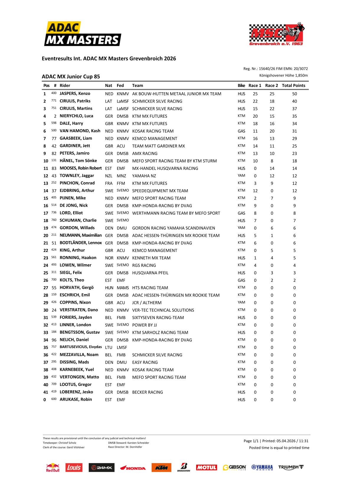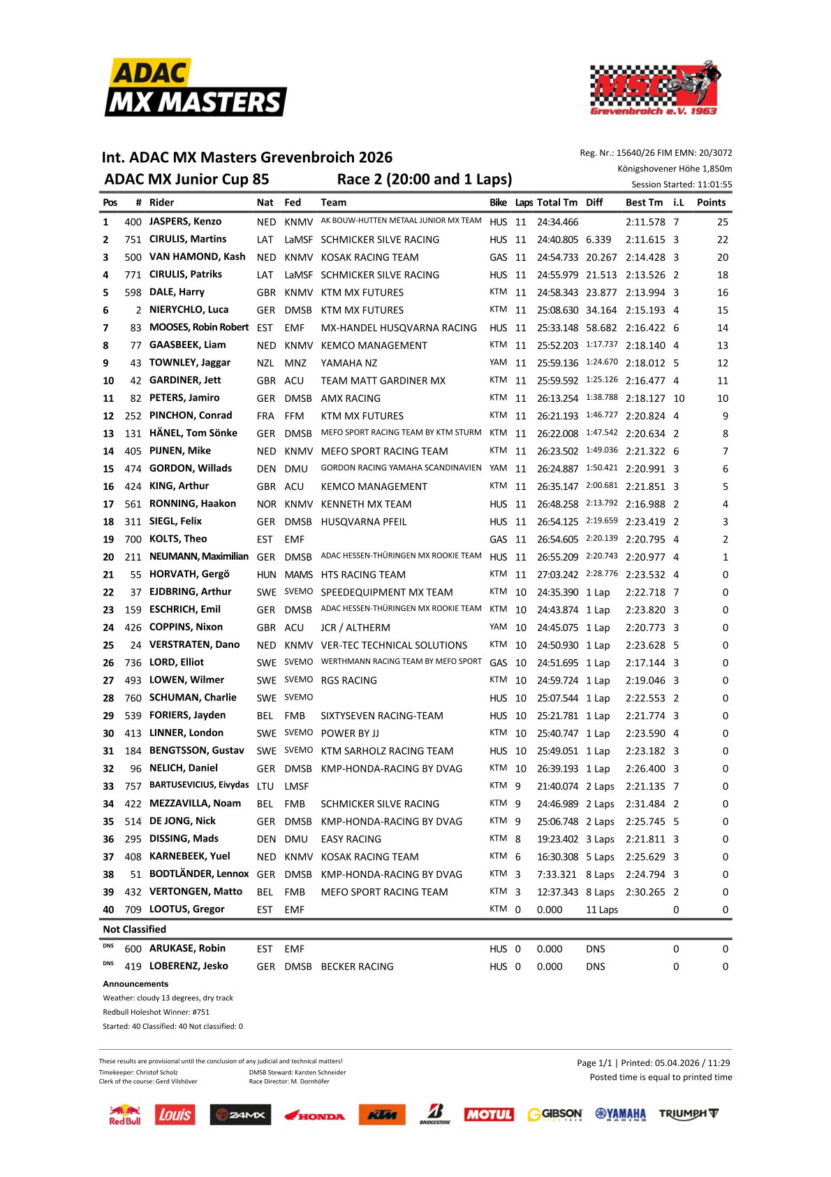 De tweede manche van de ADAC 85 Cup in Grevenbroich is opnieuw gewonnen door Kenzo Jaspers. Op de finish had Jaspers een voorsprong van 7 seconden op Martins Cirulis. Kash van Hamond sloot de manche af op een goede derde plaats. Ook Liam Gaasbeek eindigde met een achtste plaats in de top 10 en punten waren er voor Mike Pijnen (14).